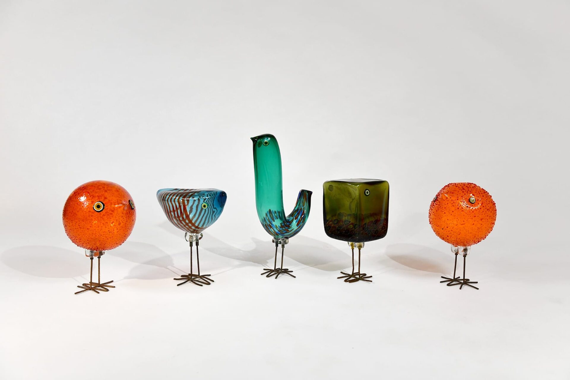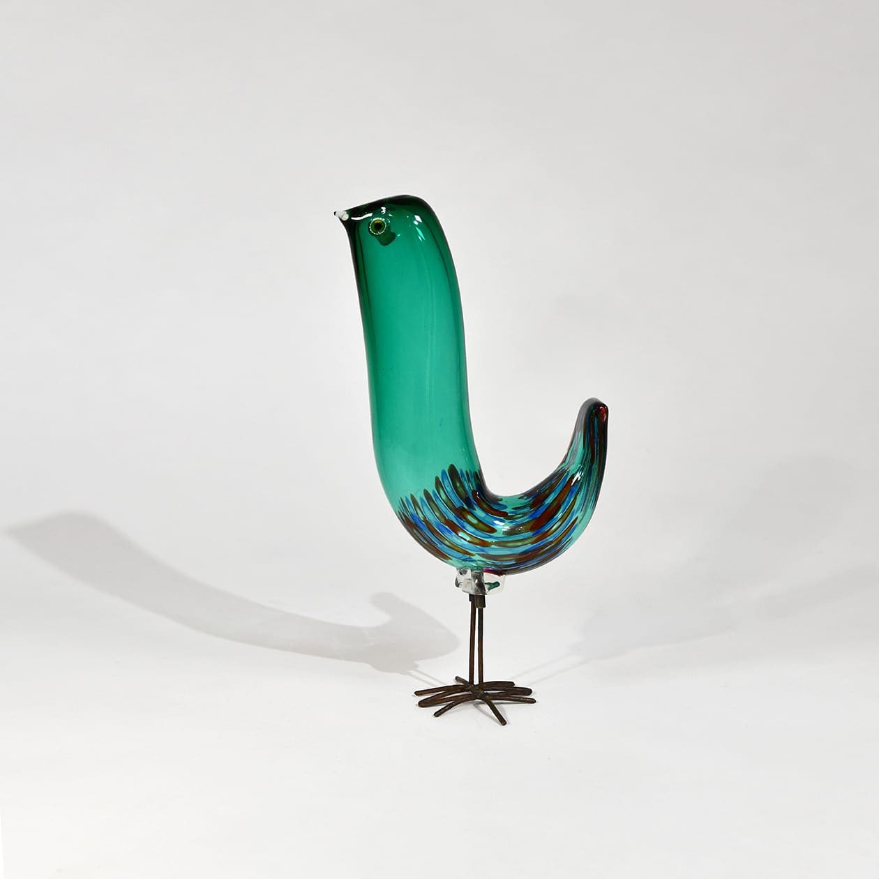 A handblown green glass figure of a bird with applied murrine eyes and copper legs