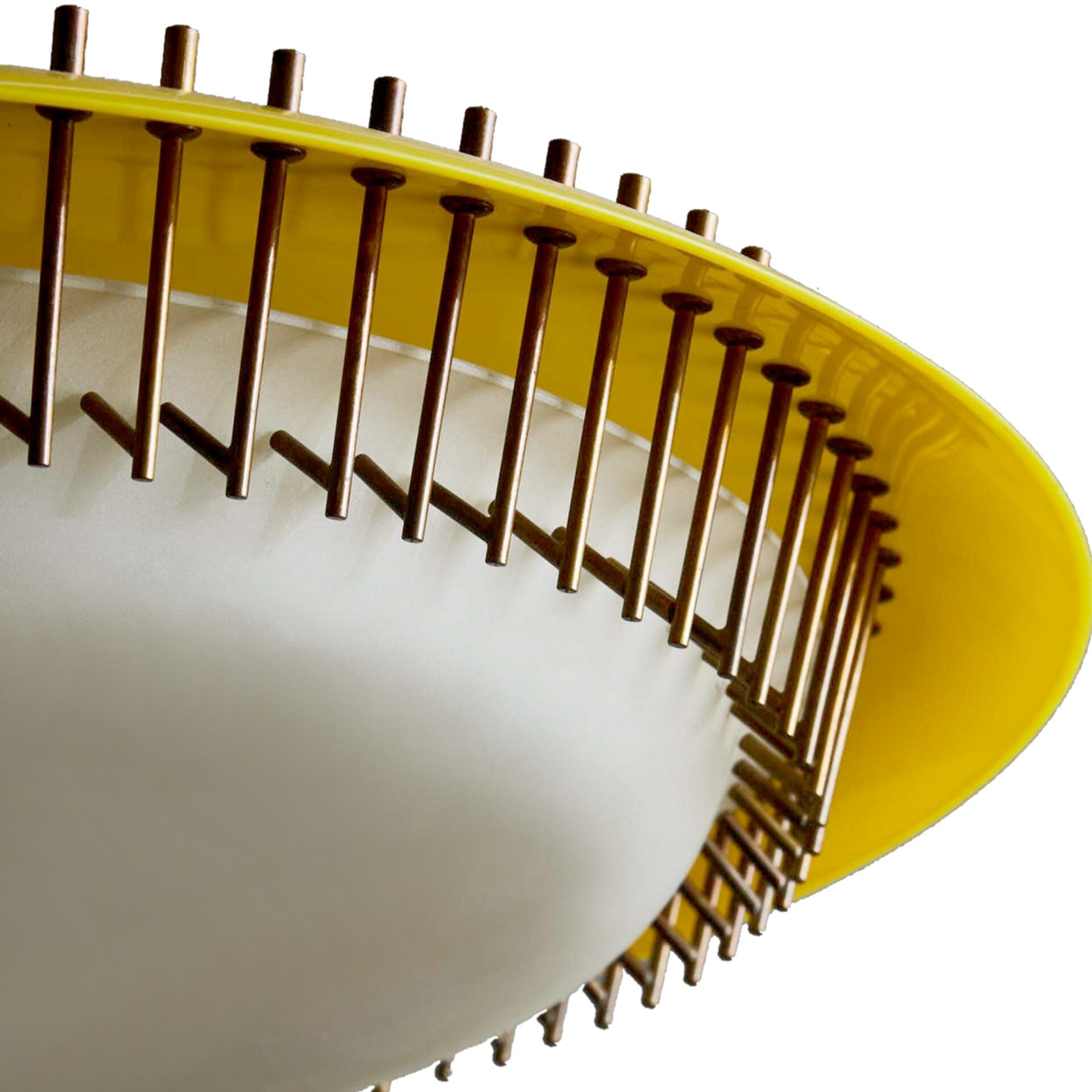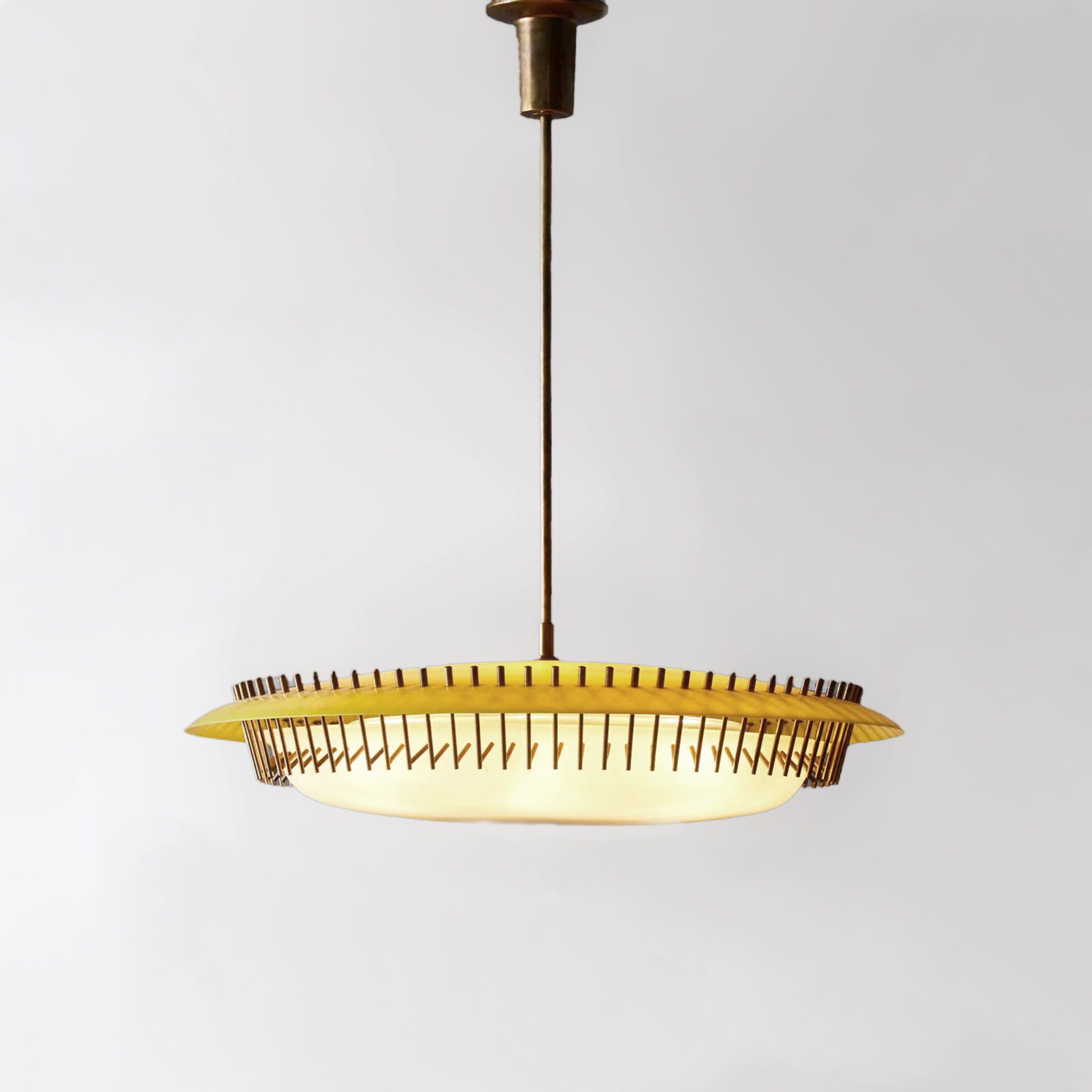 Structure in brass, reflector in coloured perspex with diffuser in white opaline glass which is suspended from a series of brass supports