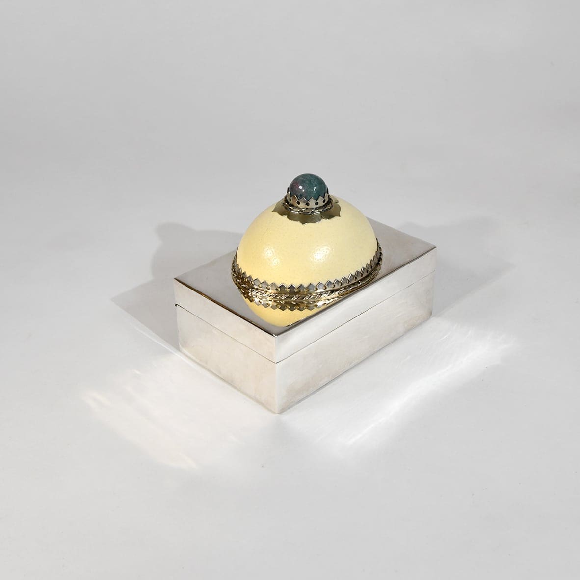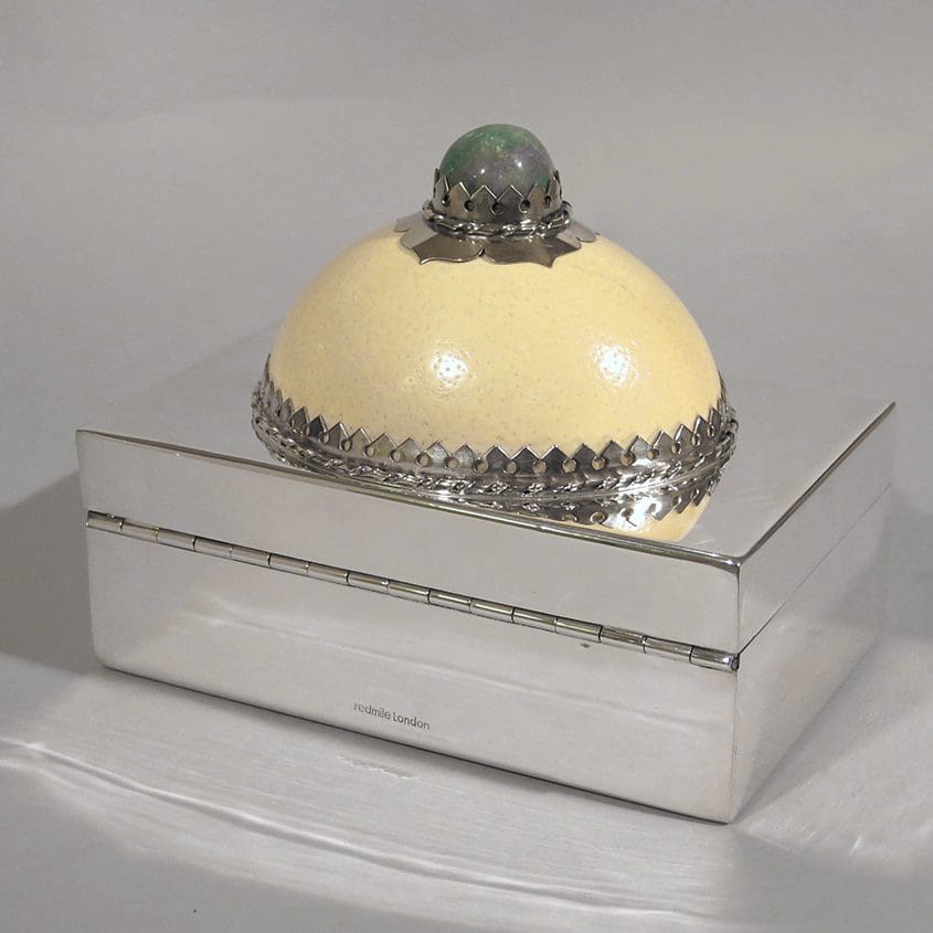 Silver plated box with ostrich eggs and semi precious stone decorations. Anthony Redmile