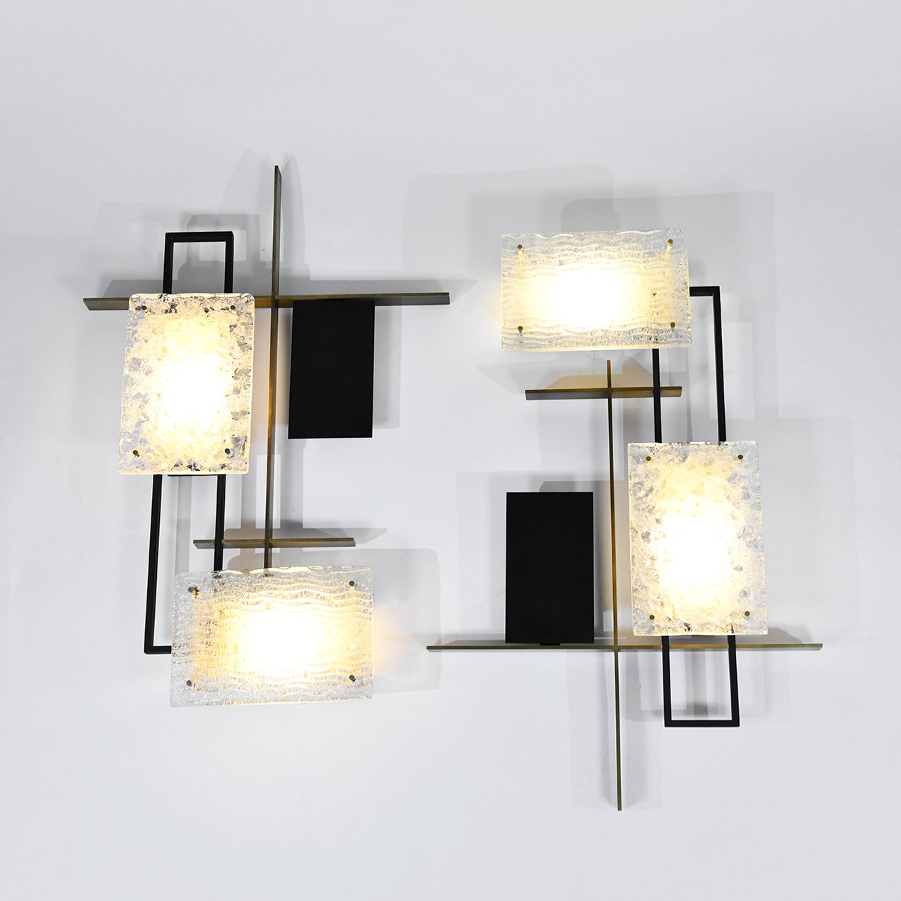 Arlus Rare large pair of geometric wall lights Painted metal, brass and moulded glass France c 1955