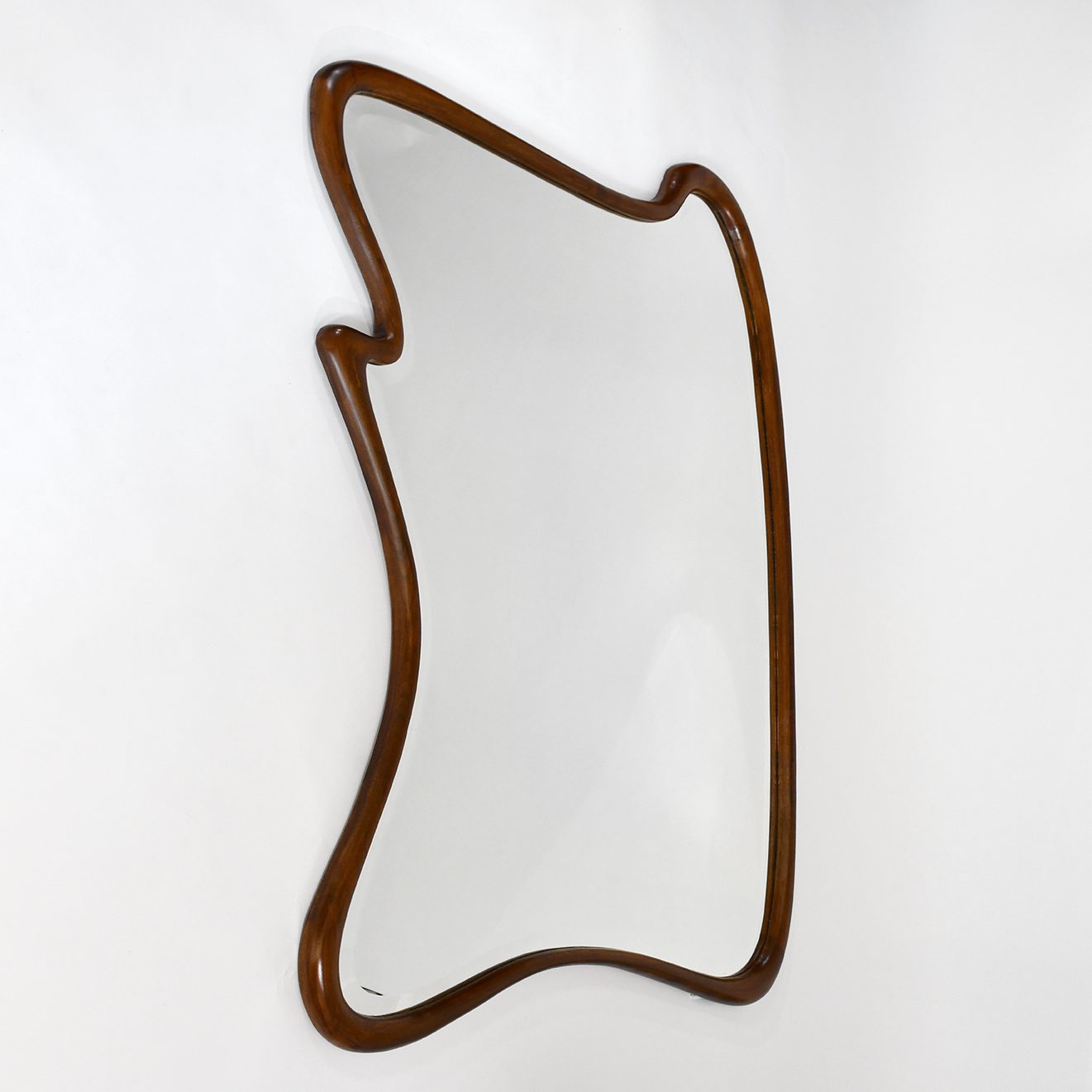 Elegant mirror with a freeform wooden frame and bevelled glass