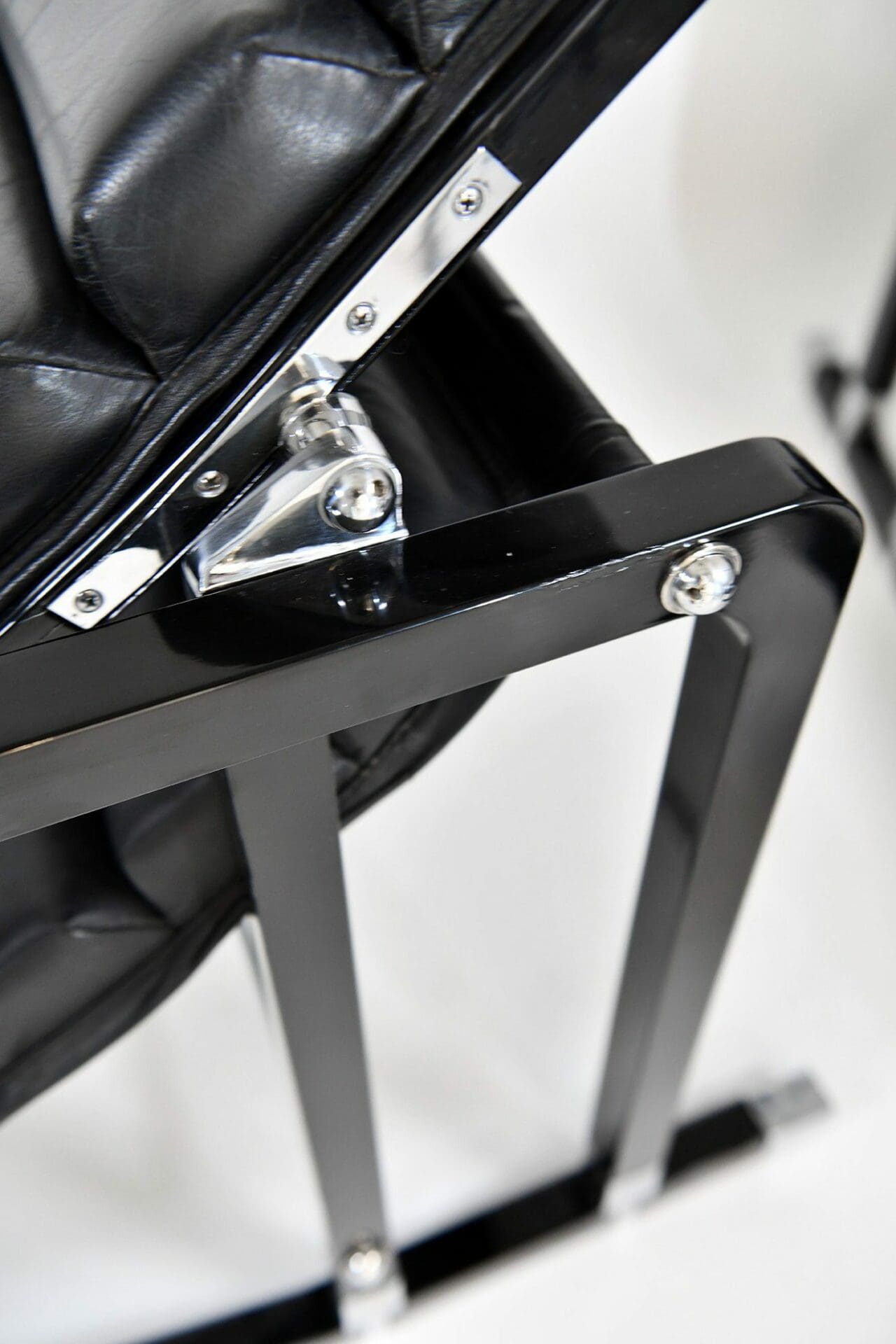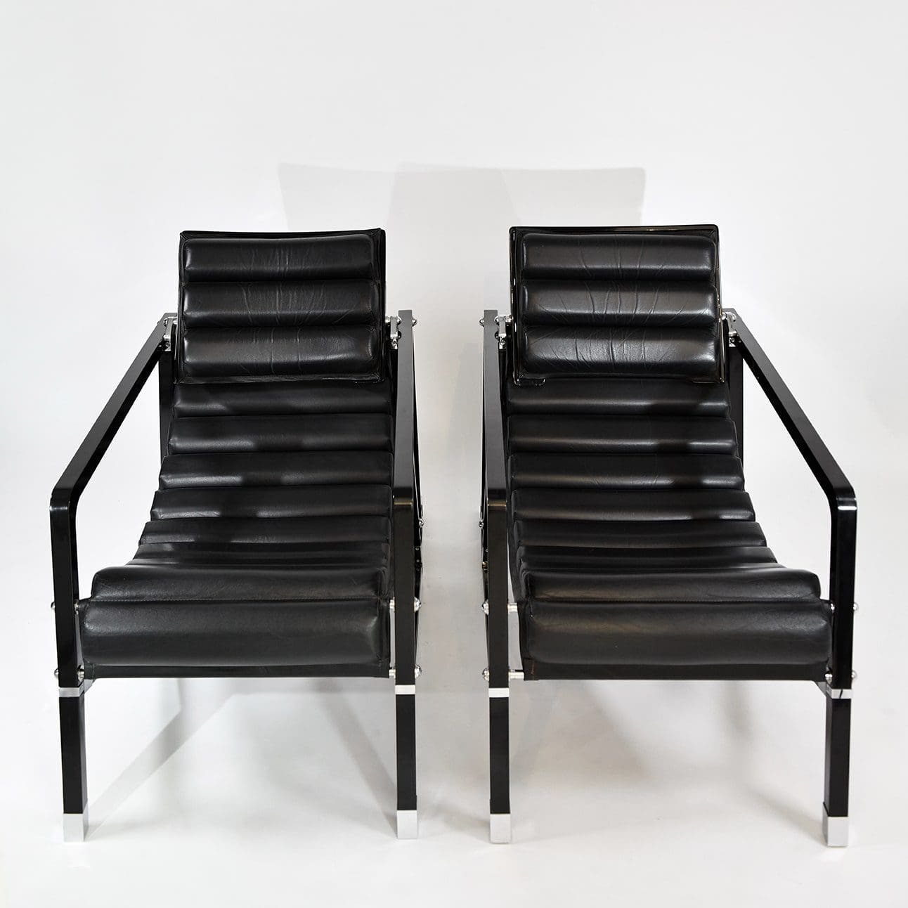 Pair of black lacquer ‘Transat, chairs Lacquered wood and black leather Originally designed 1925 by Eileen Gray (1878-1976) Produced by Andre Putnam and sold by Ecart