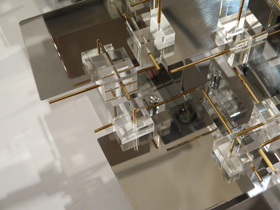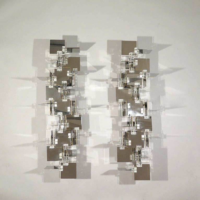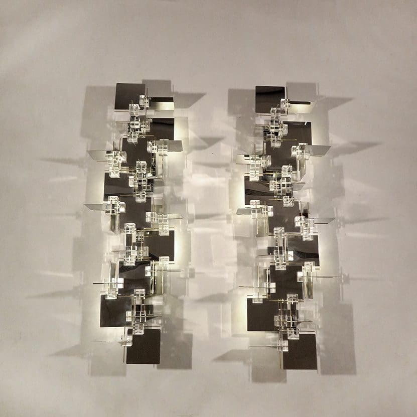 Pair of sculptural cubic wall lights Chromed metal, brass and perspex