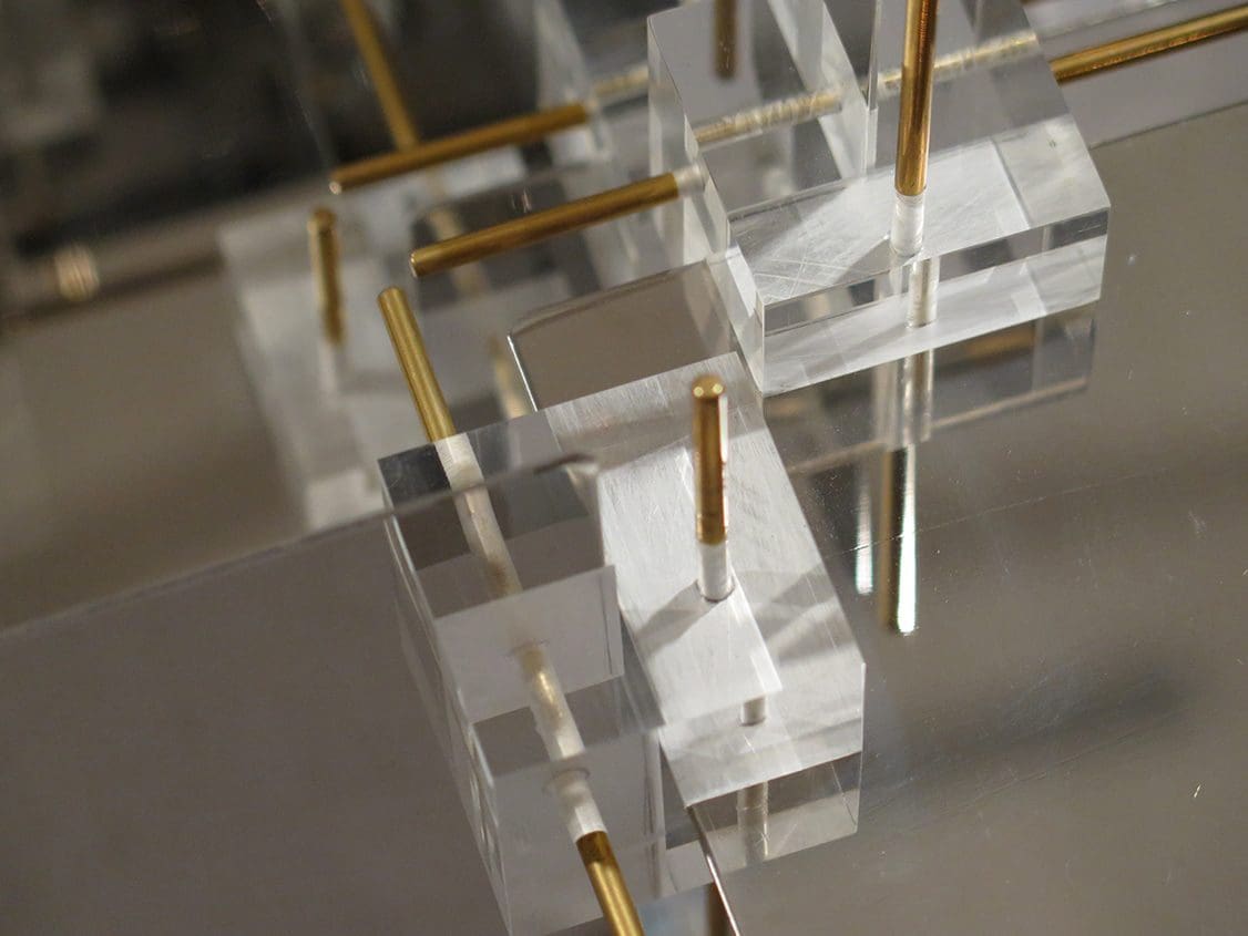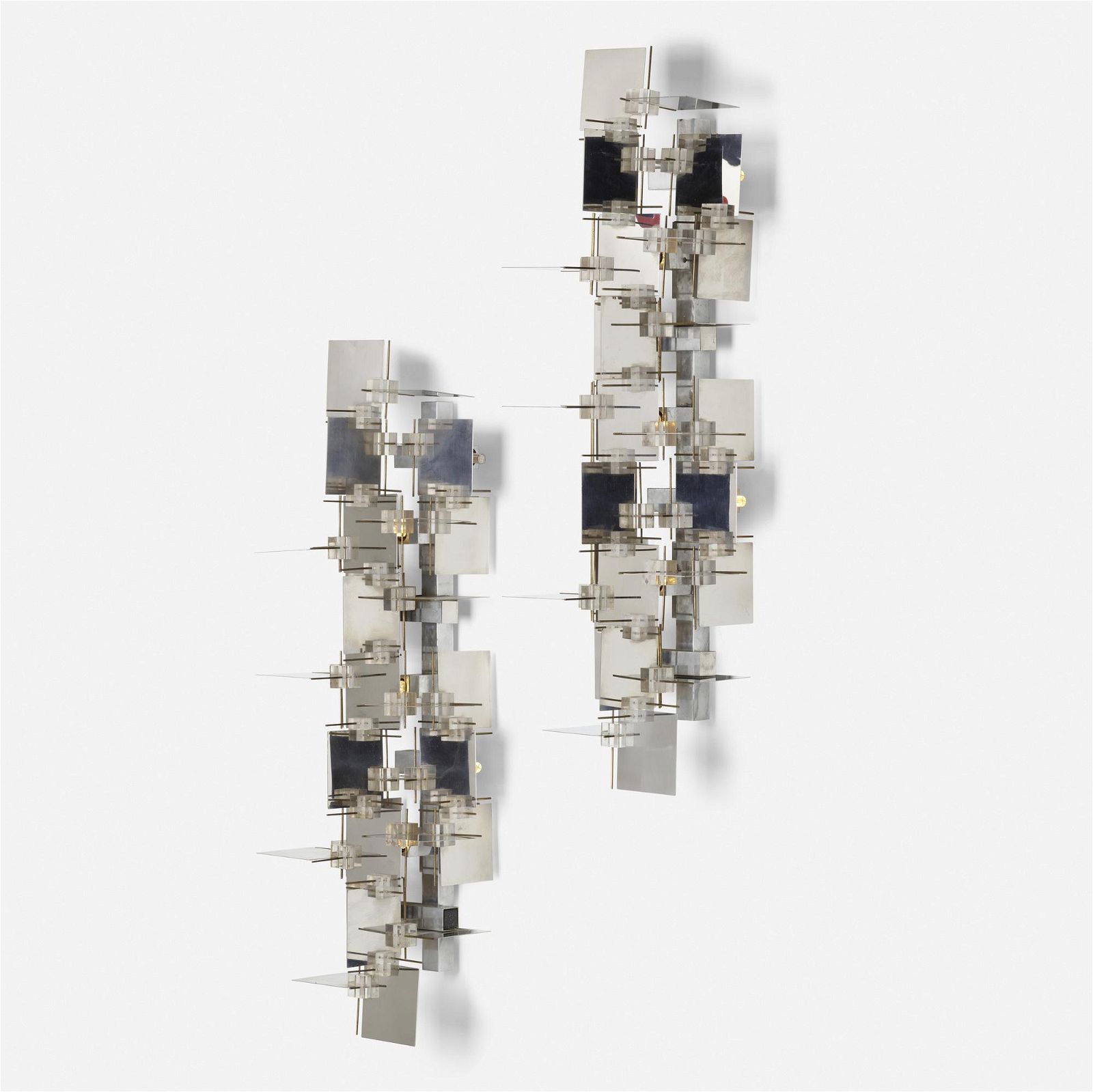 Pair of sculptural cubic wall lights Chromed metal, brass and perspex