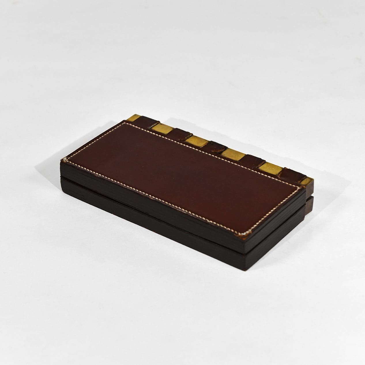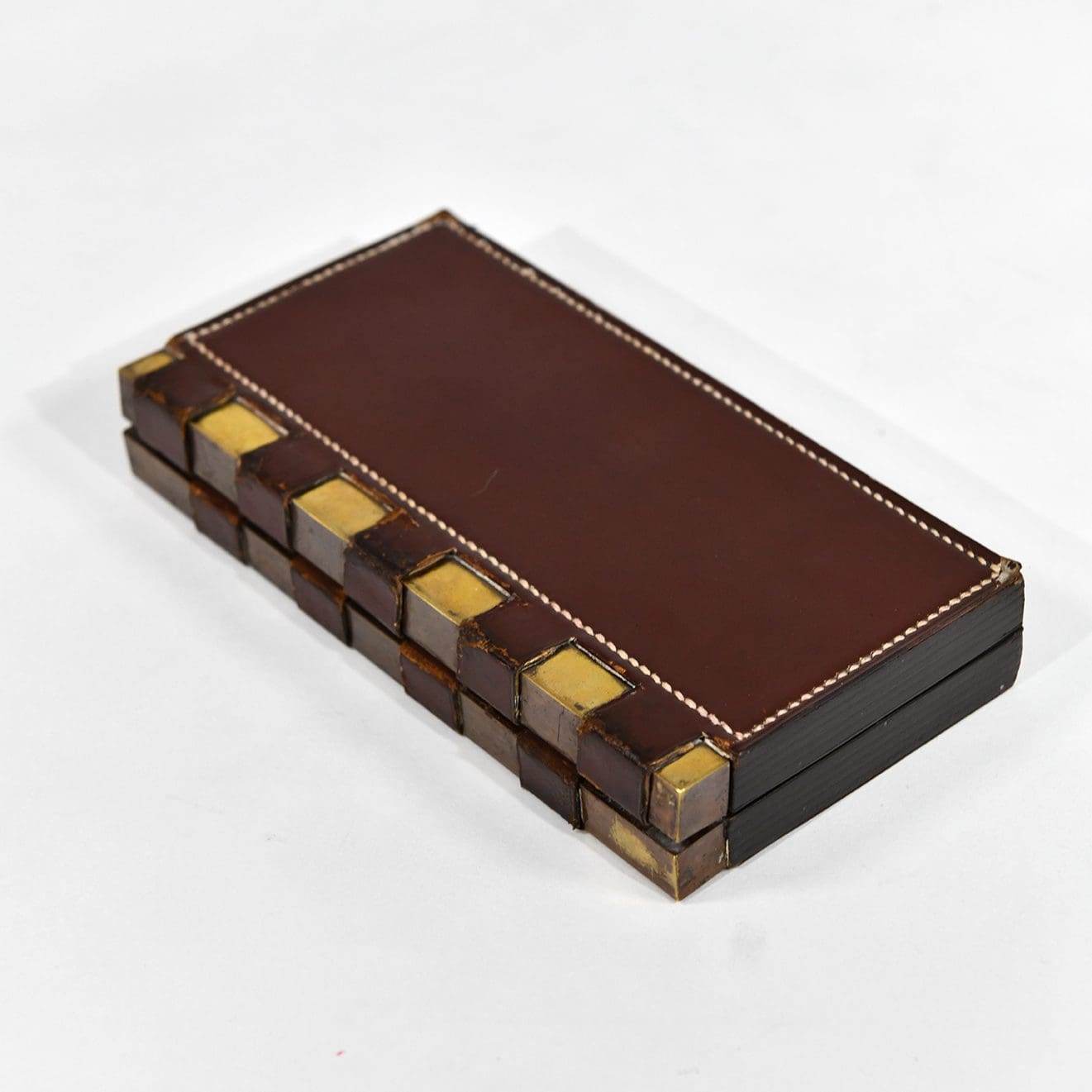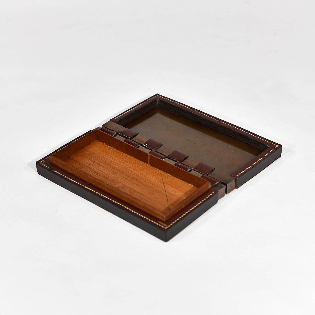 Leather Box Designed by Paul Dupre-Lafon Stitched leather,wood interior and brass. Stamped Hermes Paris. c 1950. France