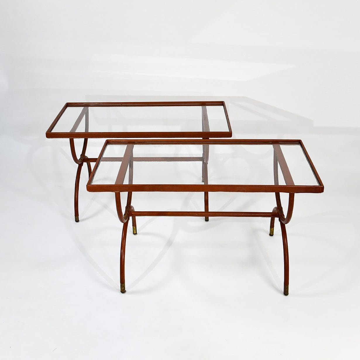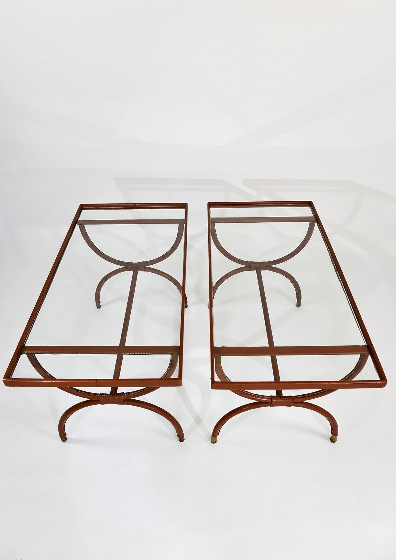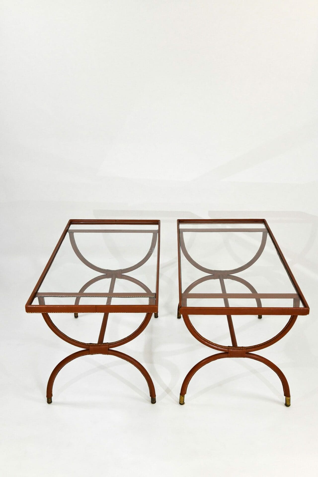 Pair of stitched leather and glass tables. Jacques Adnet