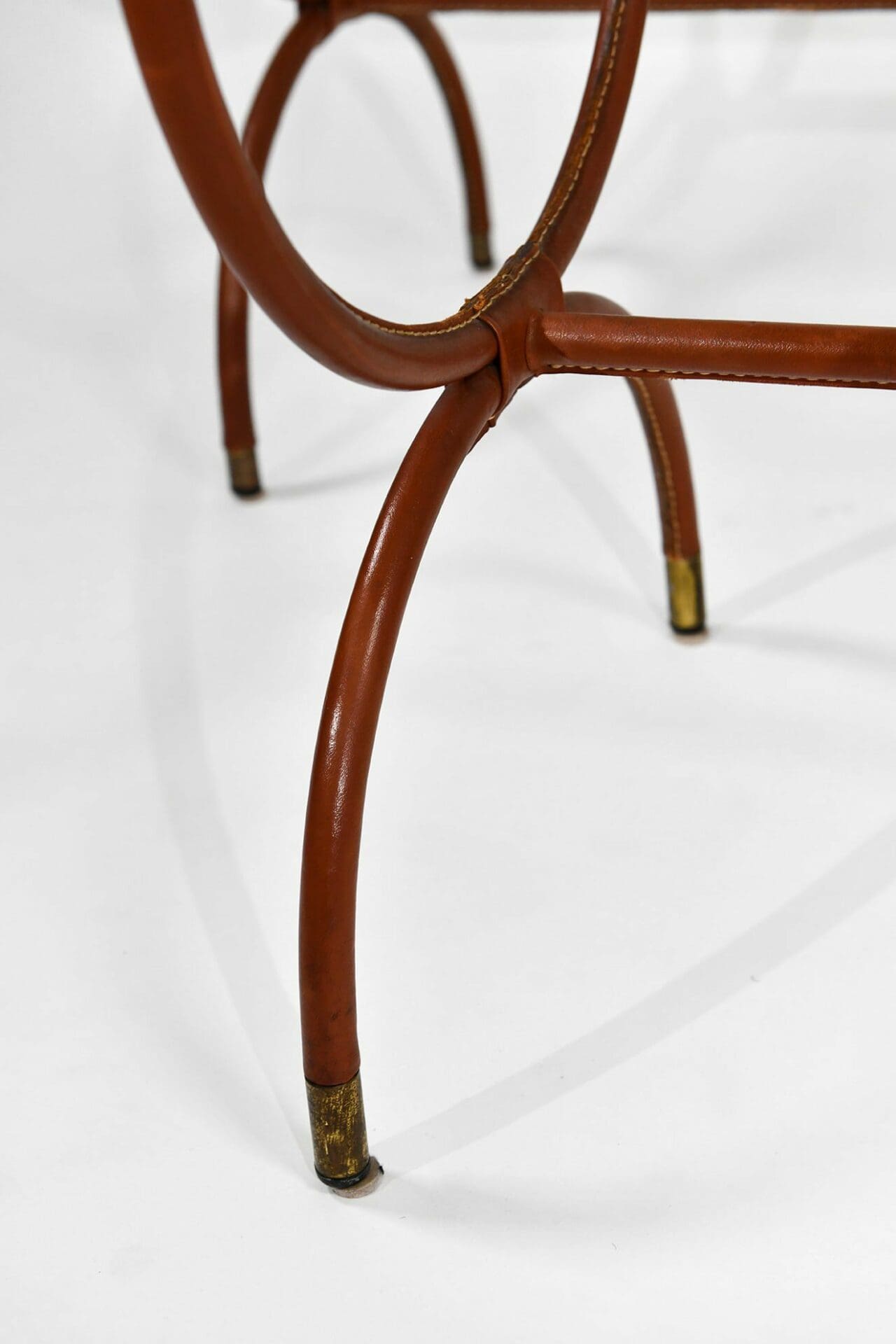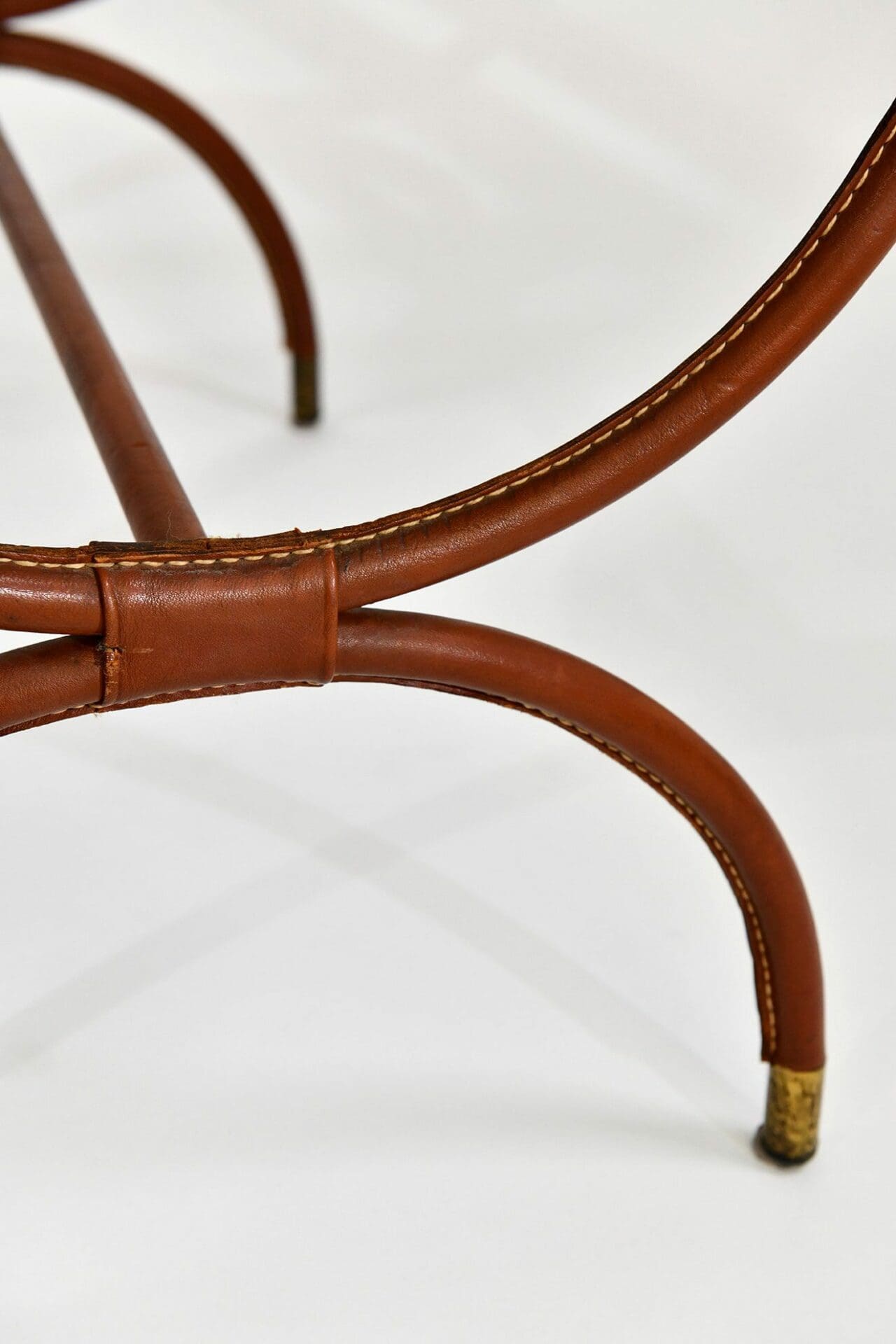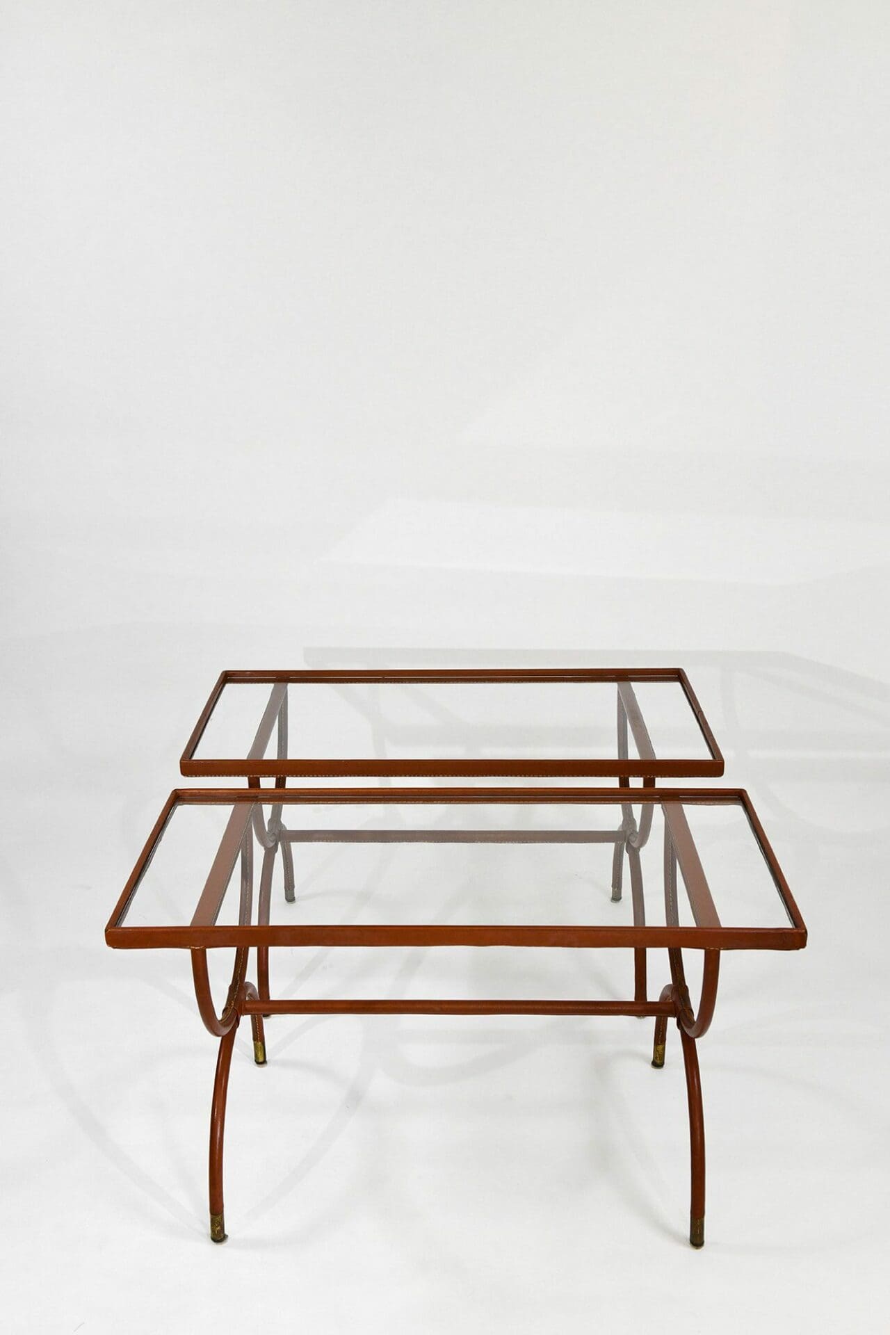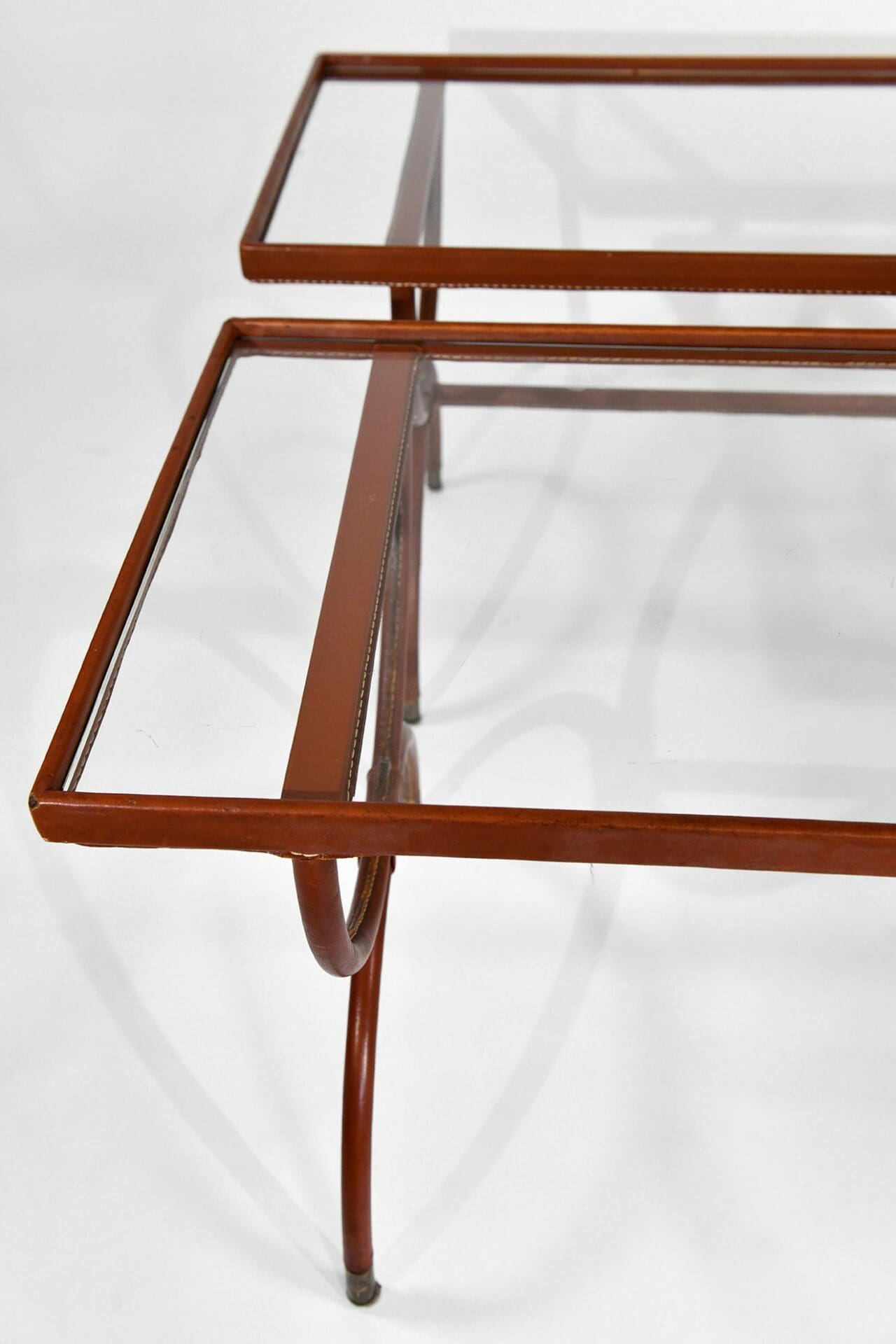 Pair of stitched leather and glass tables. Jacques Adnet