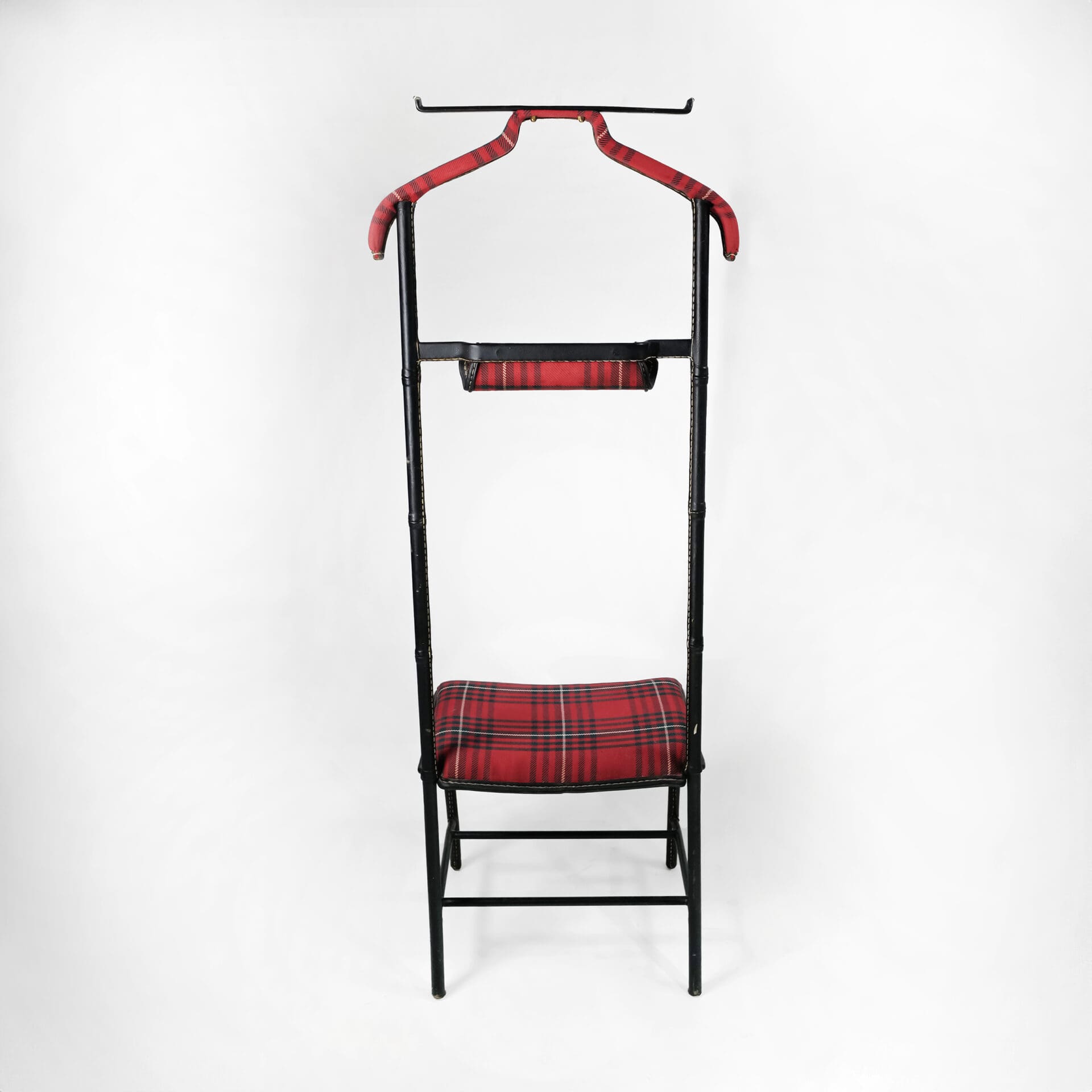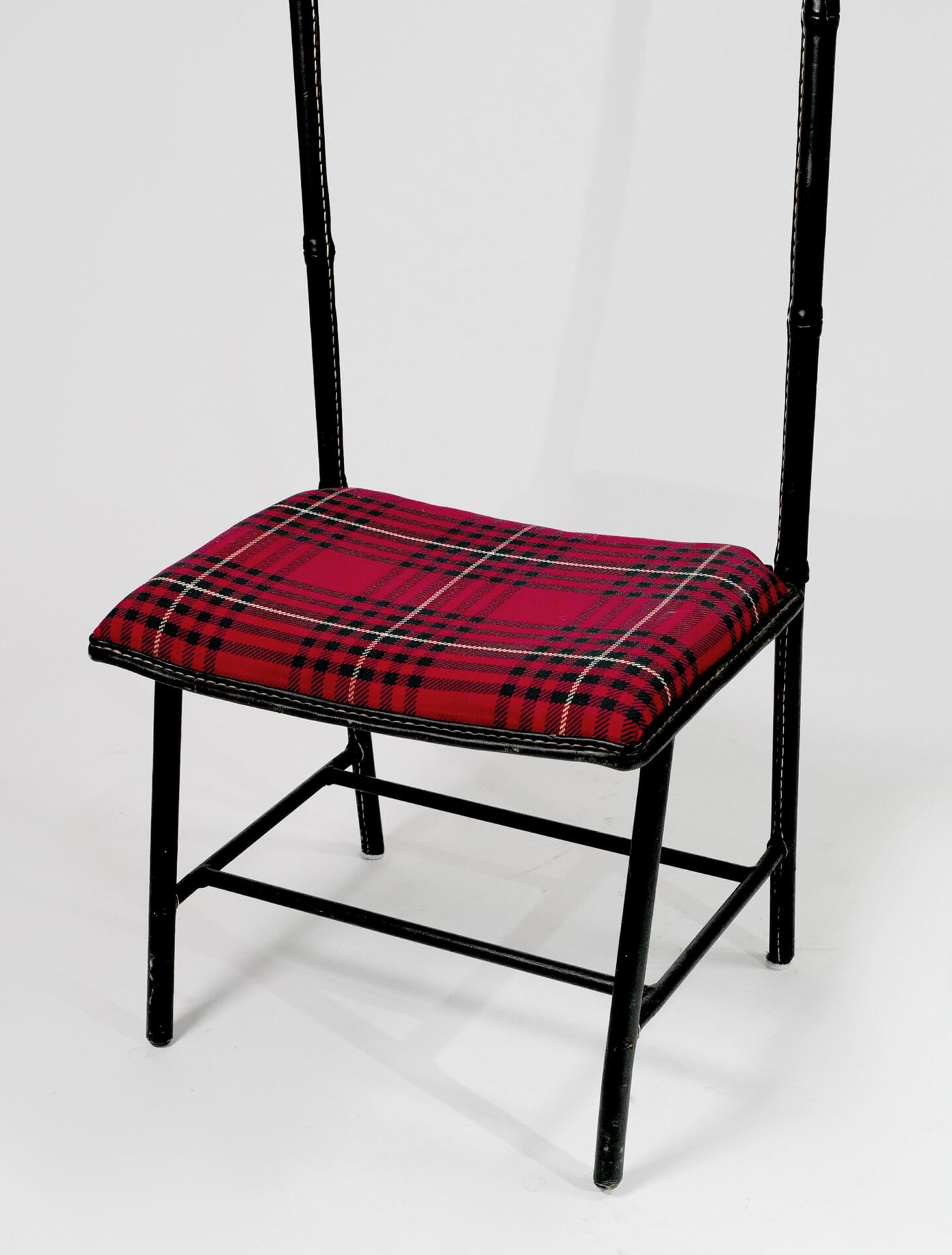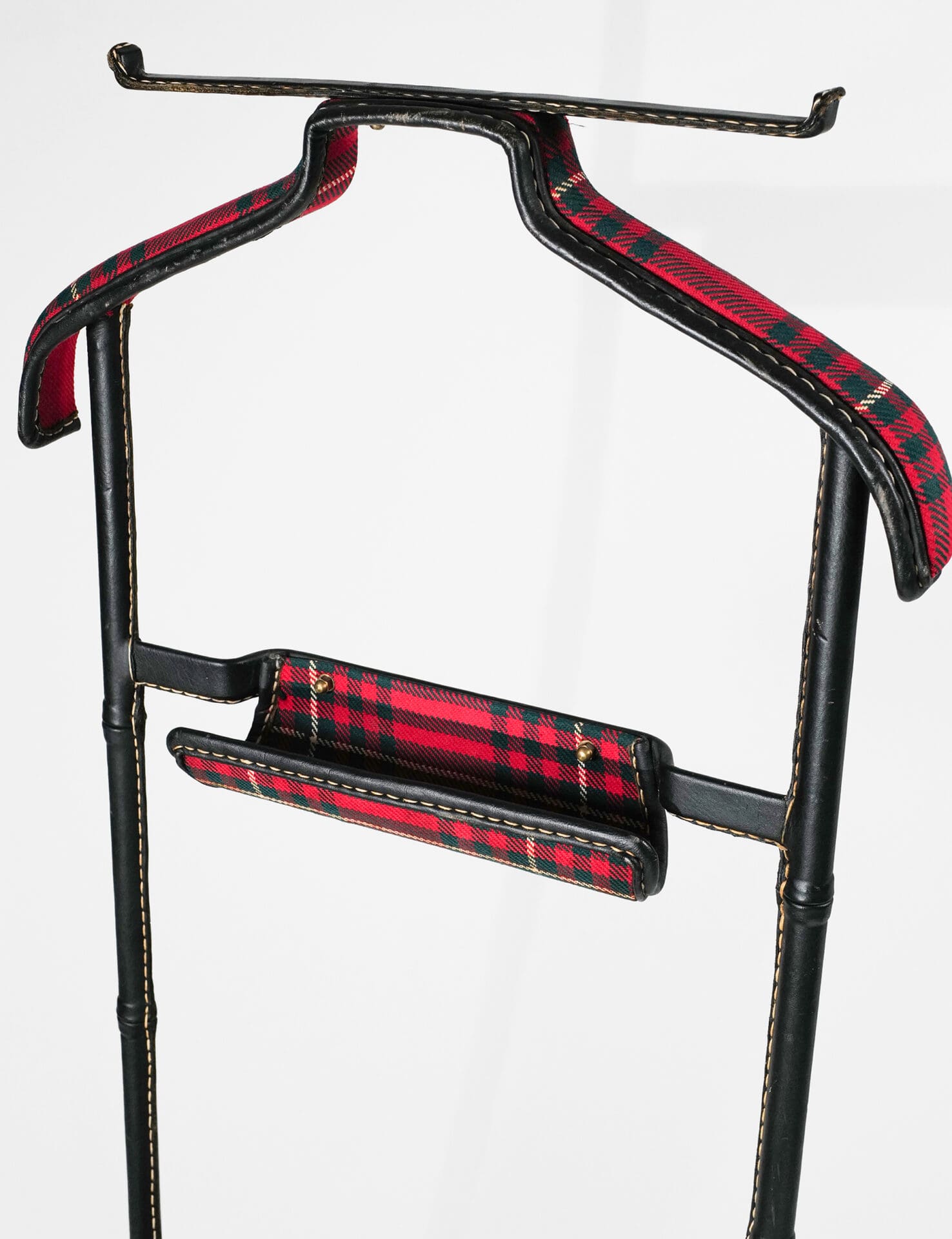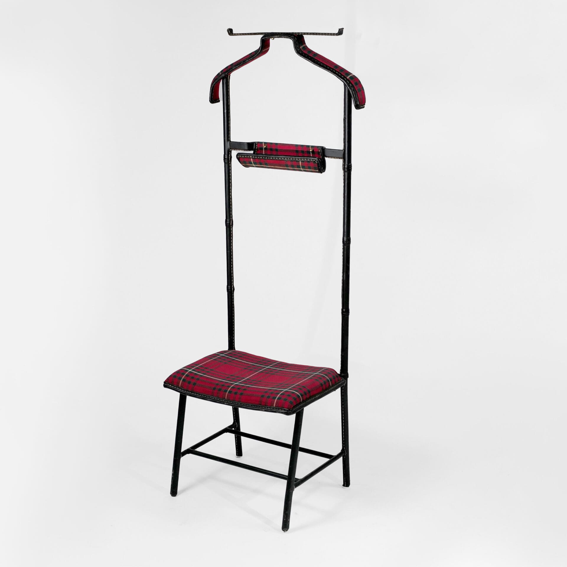 Jacques Adnet (1900-1984) Valet de nuit incorporating a seat Brass, stitched faux leather, tartan upholstery c. 1955 France