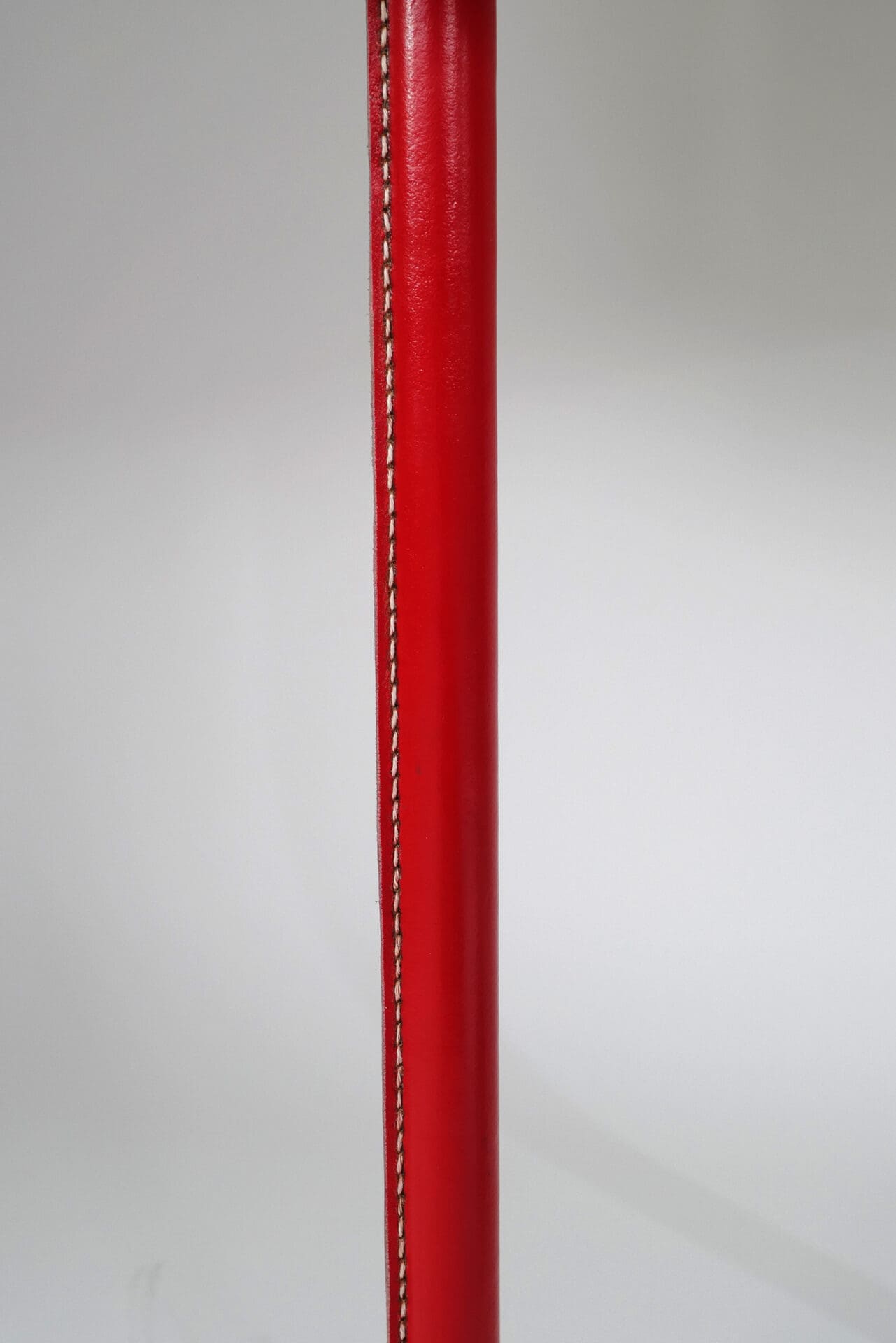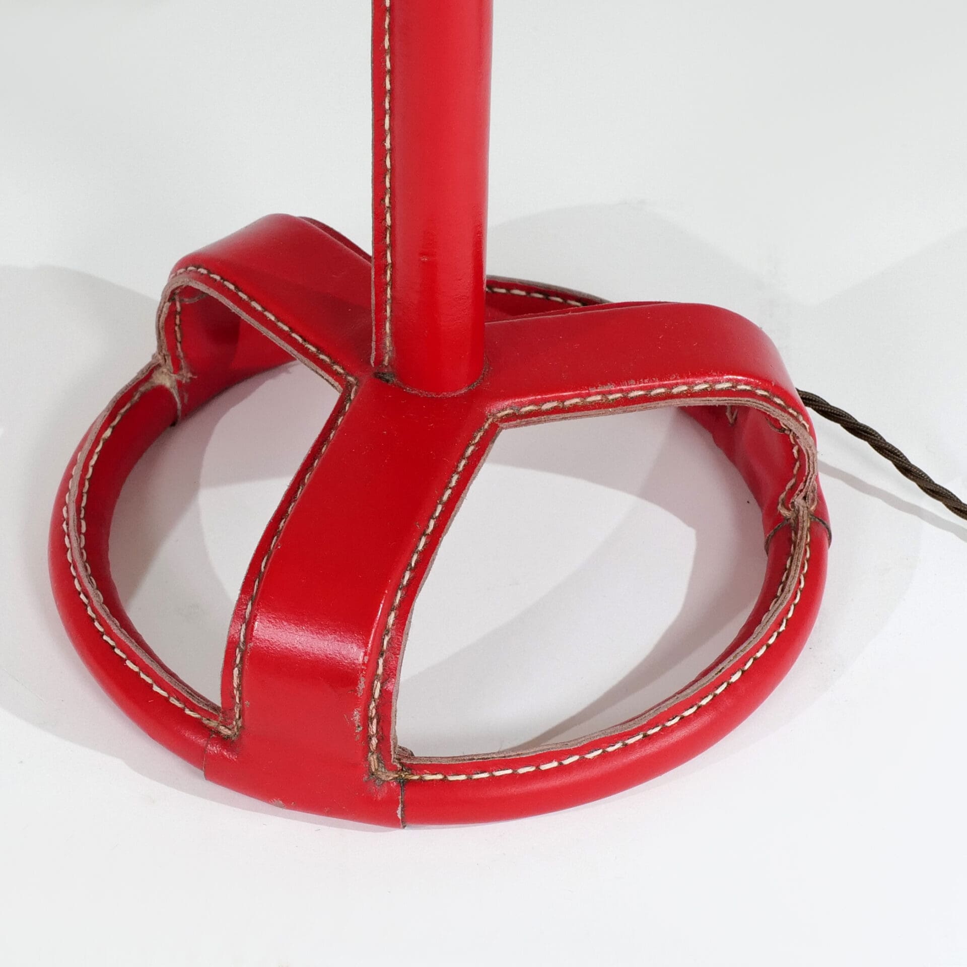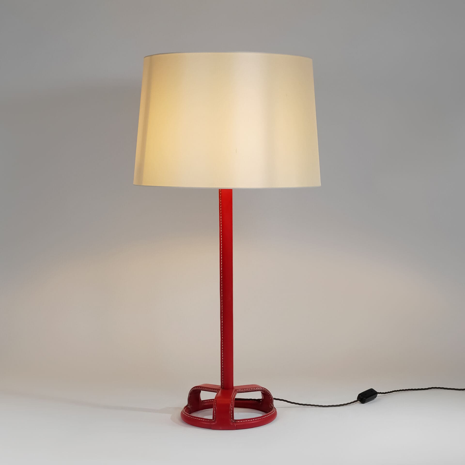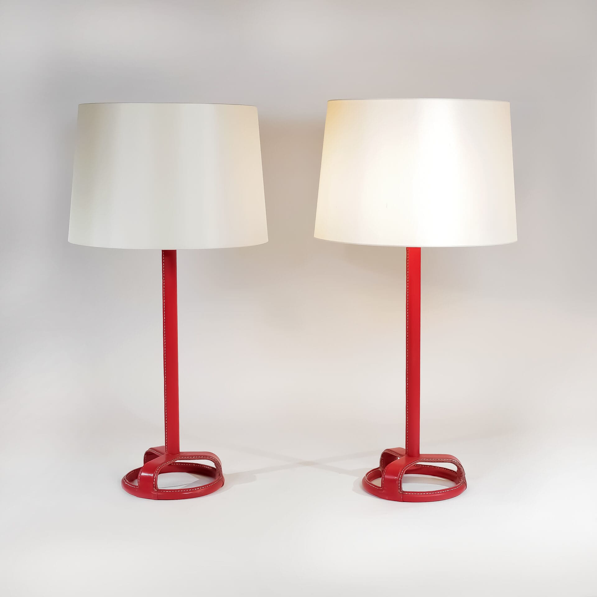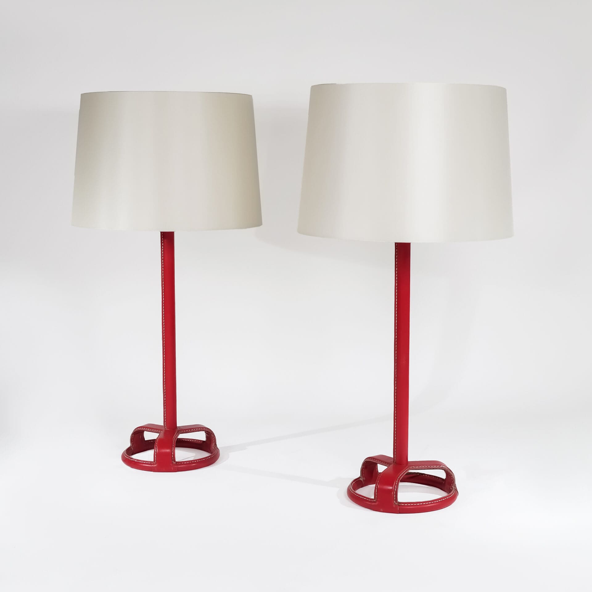 Jacques Adnet (1900-1984) Pair of table lamps Steel, red stitched leather and brass c. 1955 France