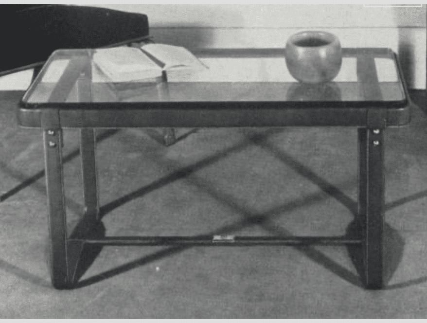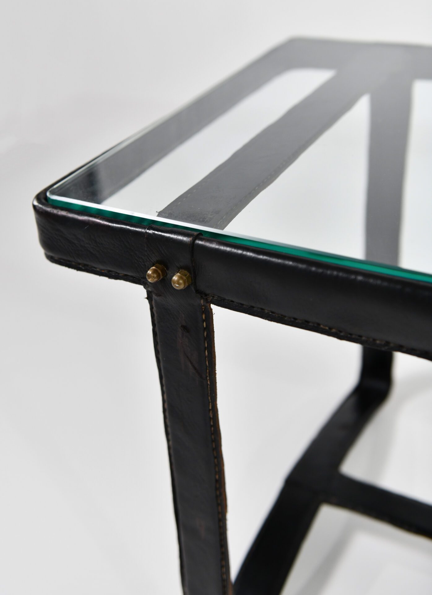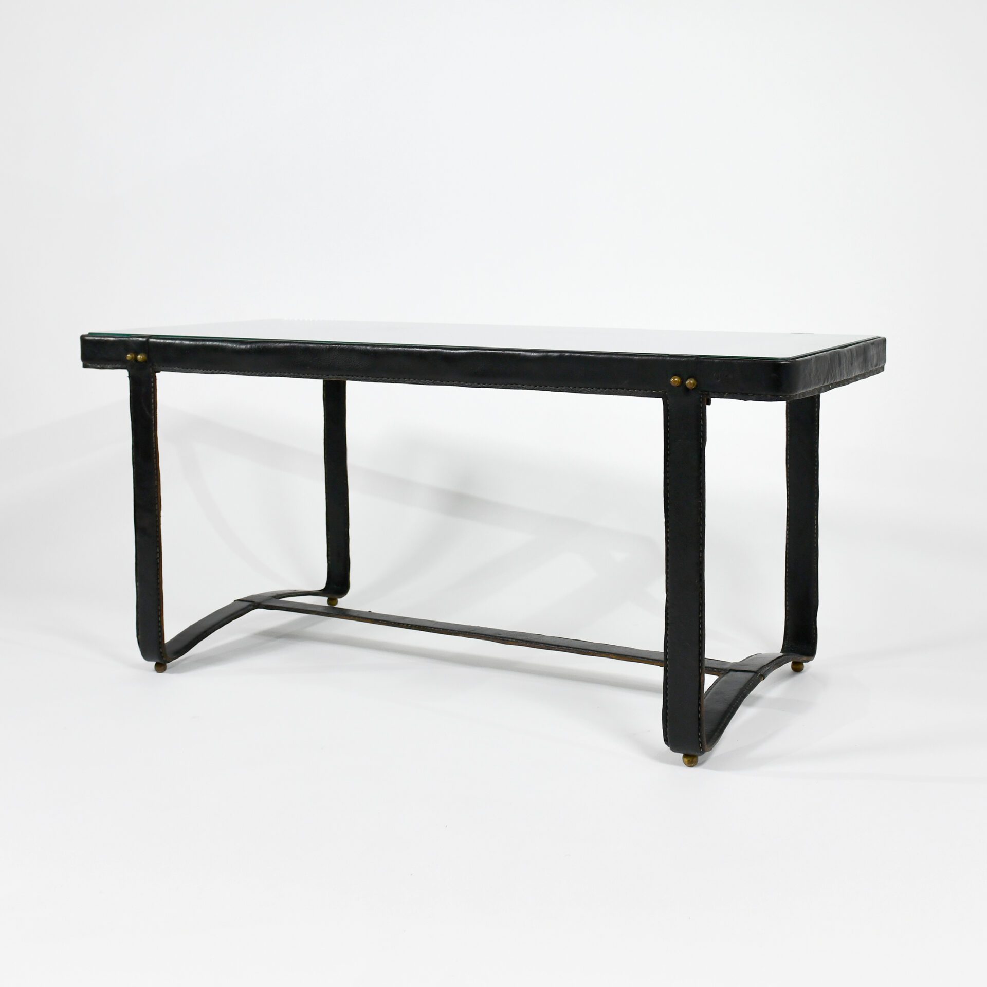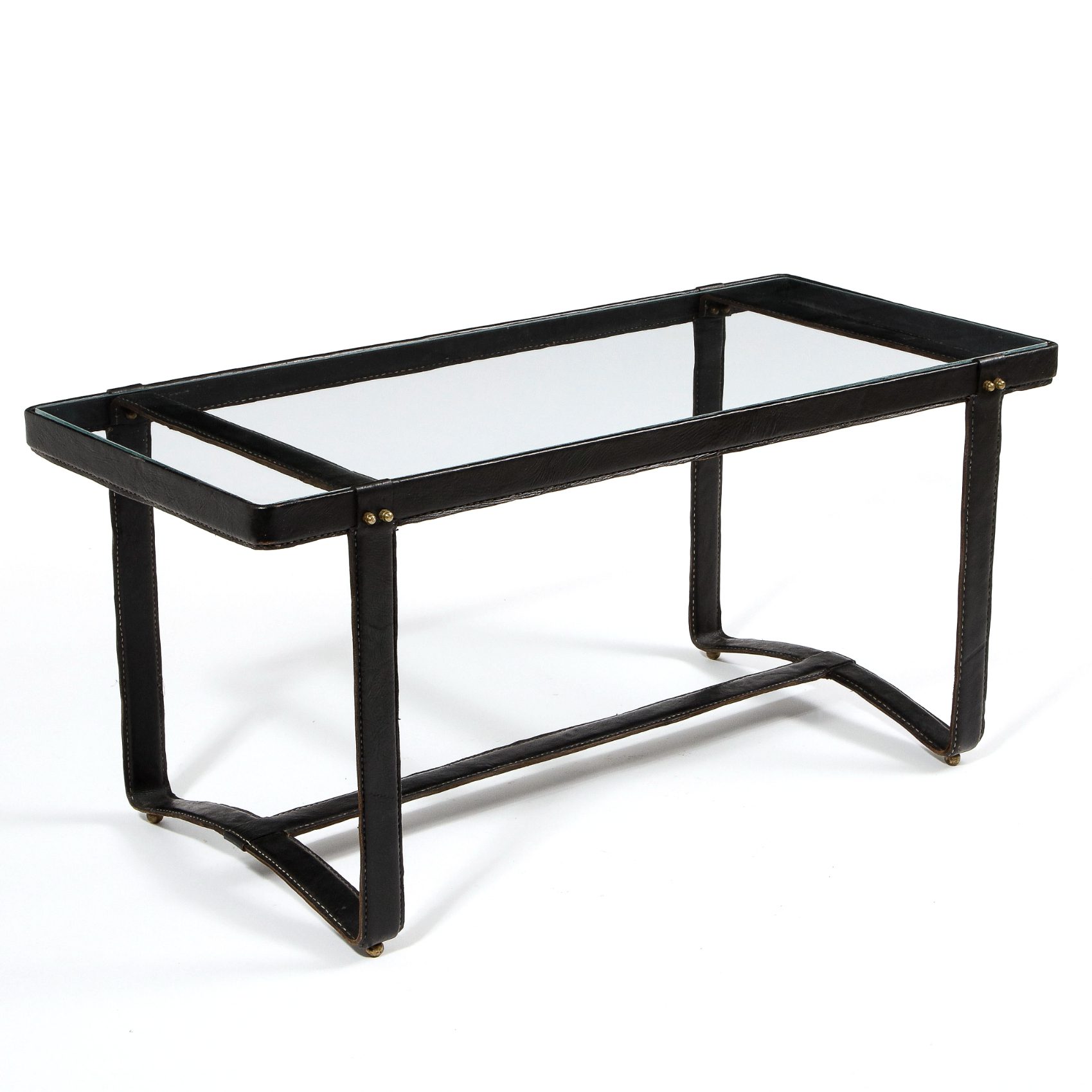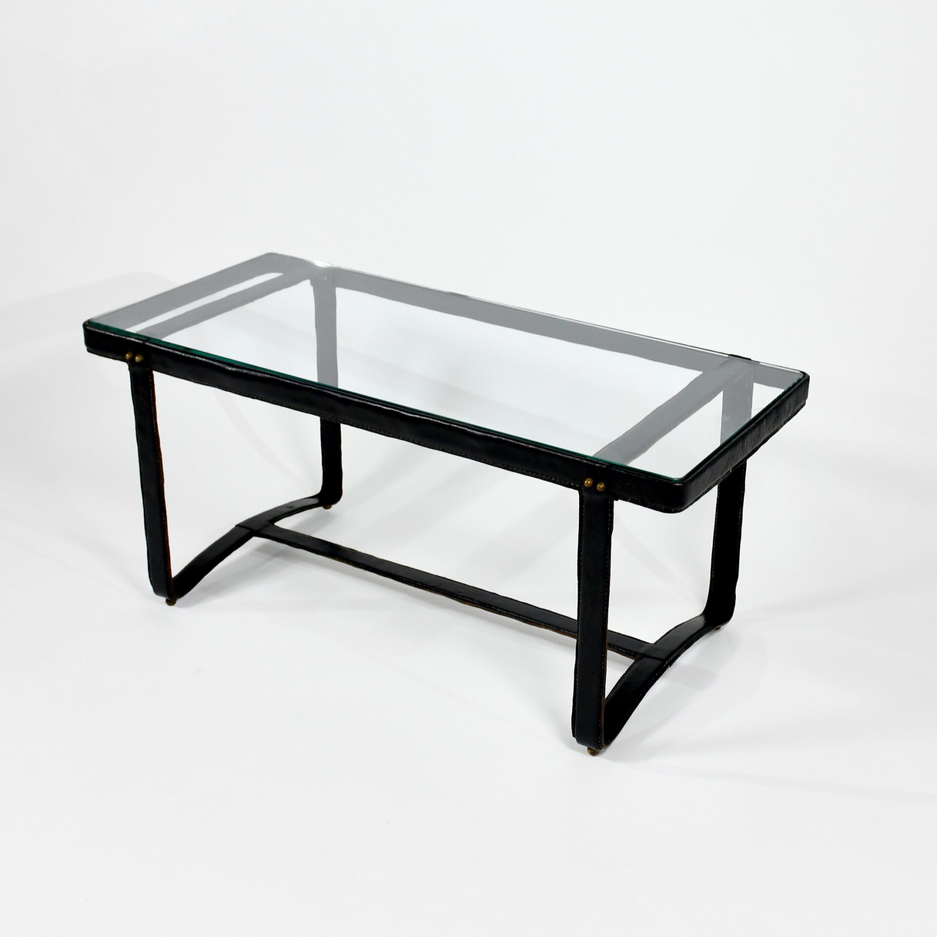 Jaques Adnet (1900-1984) Rectangular coffee table Stitched leather, steel and brass with glass top c. 1950 France