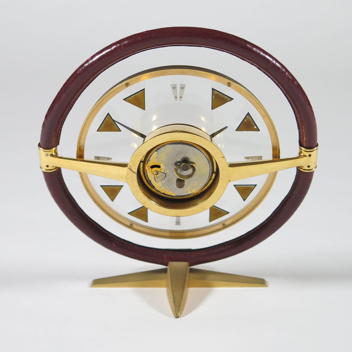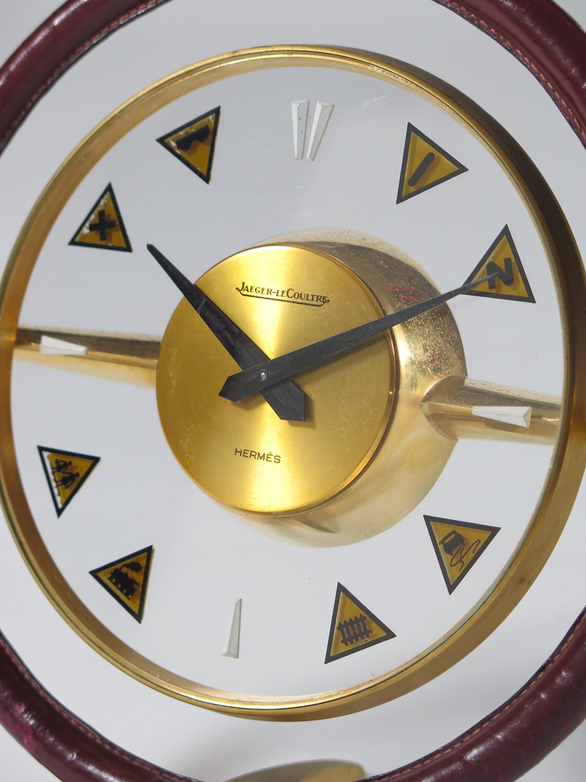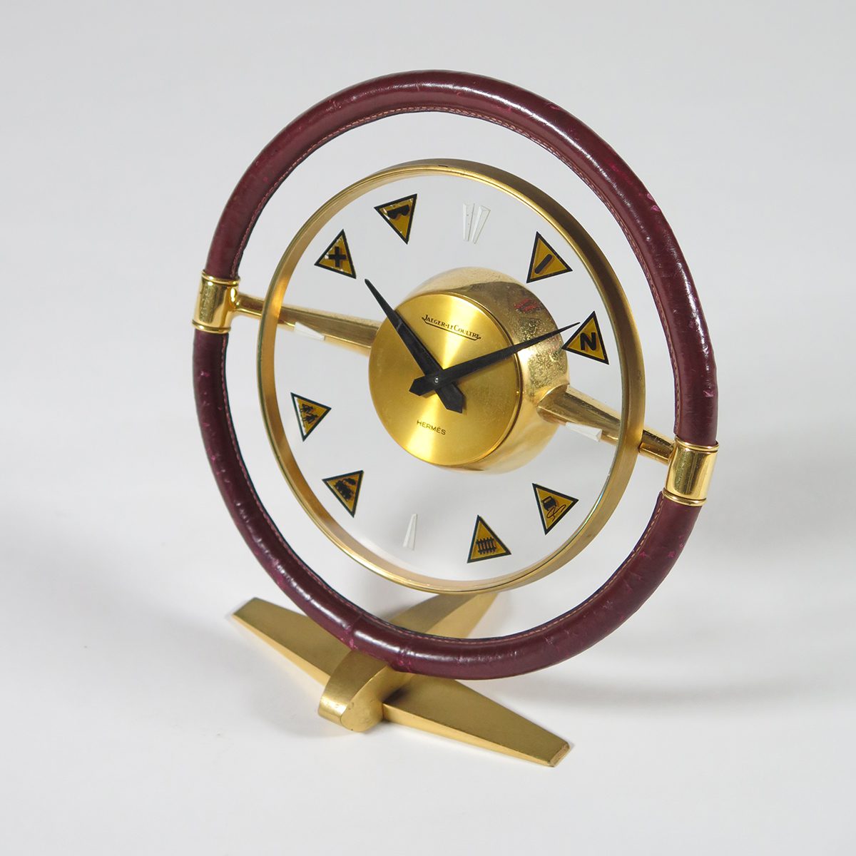 JAEGER-LECOULTRE & HERMES Brass and stitched leather. Model Volant Reference 356. Marked Jaeger-LeCoultre & Hermes. Diameter 19.5 cm