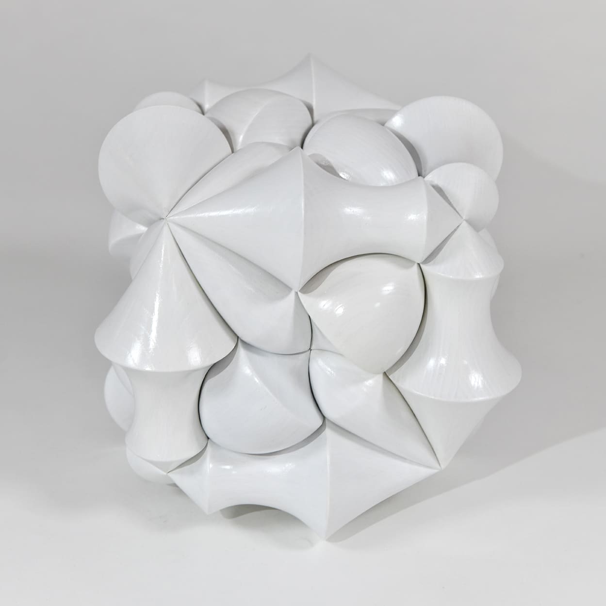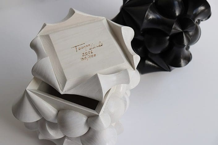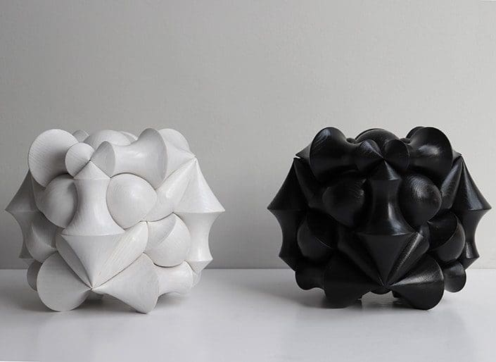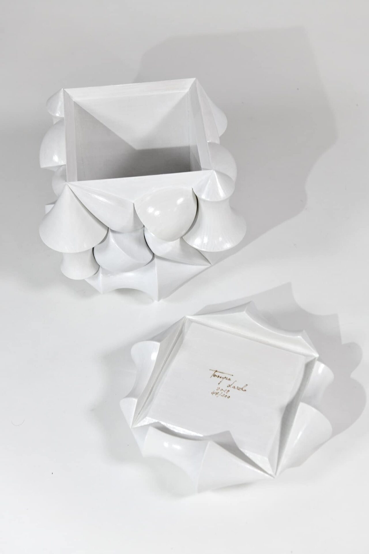 A wooden storage box with a lid. A cube is seamlessly covered with three different bodies of revolution that engage in each other, thereby producing a powerful, geometrical design sculpture. The decorating elements create an optical illusion—one would not think at first sight that the box contains a relatively large storage space.
