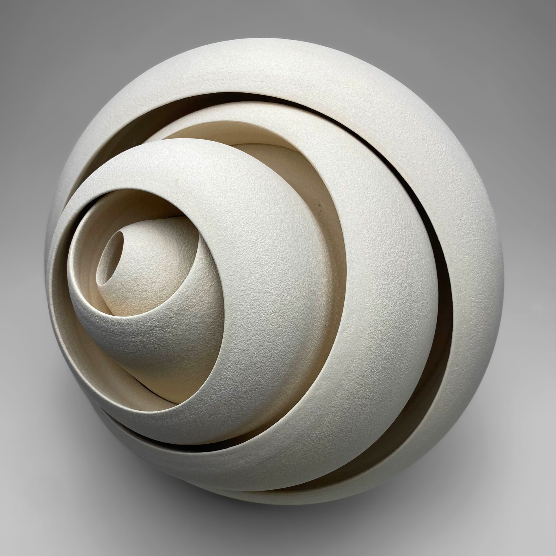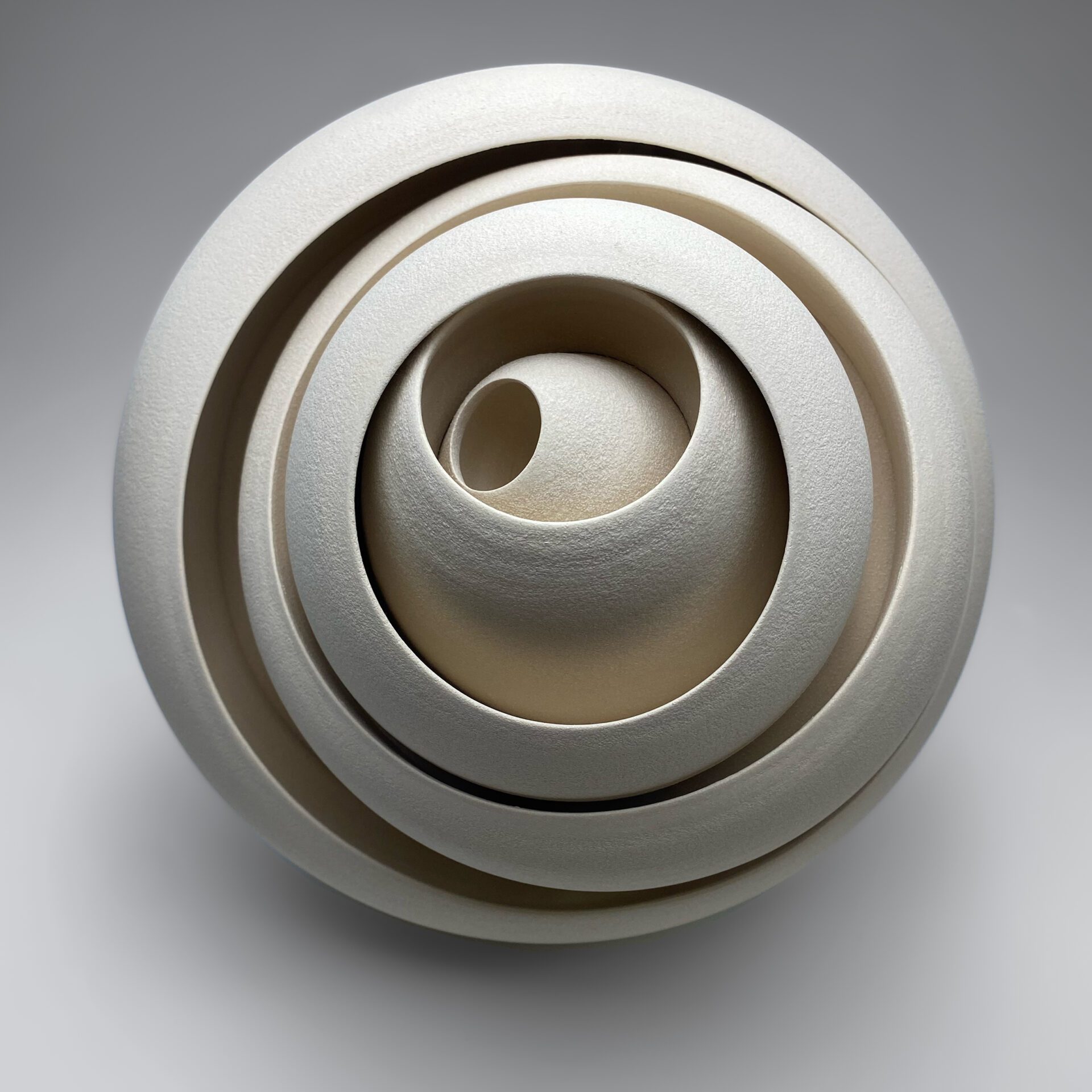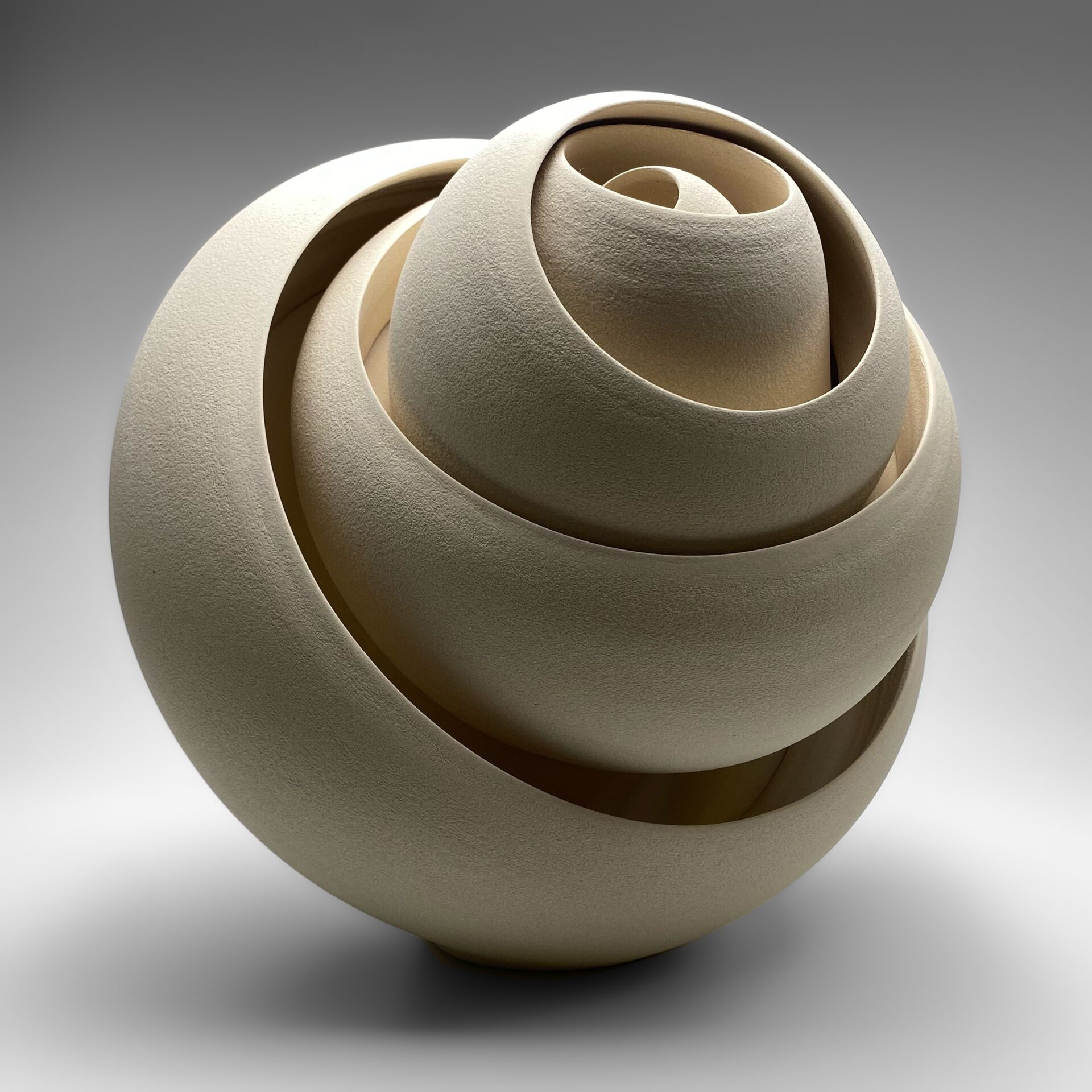 Matthew’s influences and inspirations for his beautiful ceramic circular sculptures include – geometric and optical art, constructivist themes, and modern architecture and design. He pursues these interests in an abstract sense by exploring shape and making mathematically constructed pieces in clay, each built up of many different wheel-thrown sections. On completion each form conveys different and individual properties of space, light, and colour, and sustains an expression of abstract and rhythmical beauty from its pattern of shape.