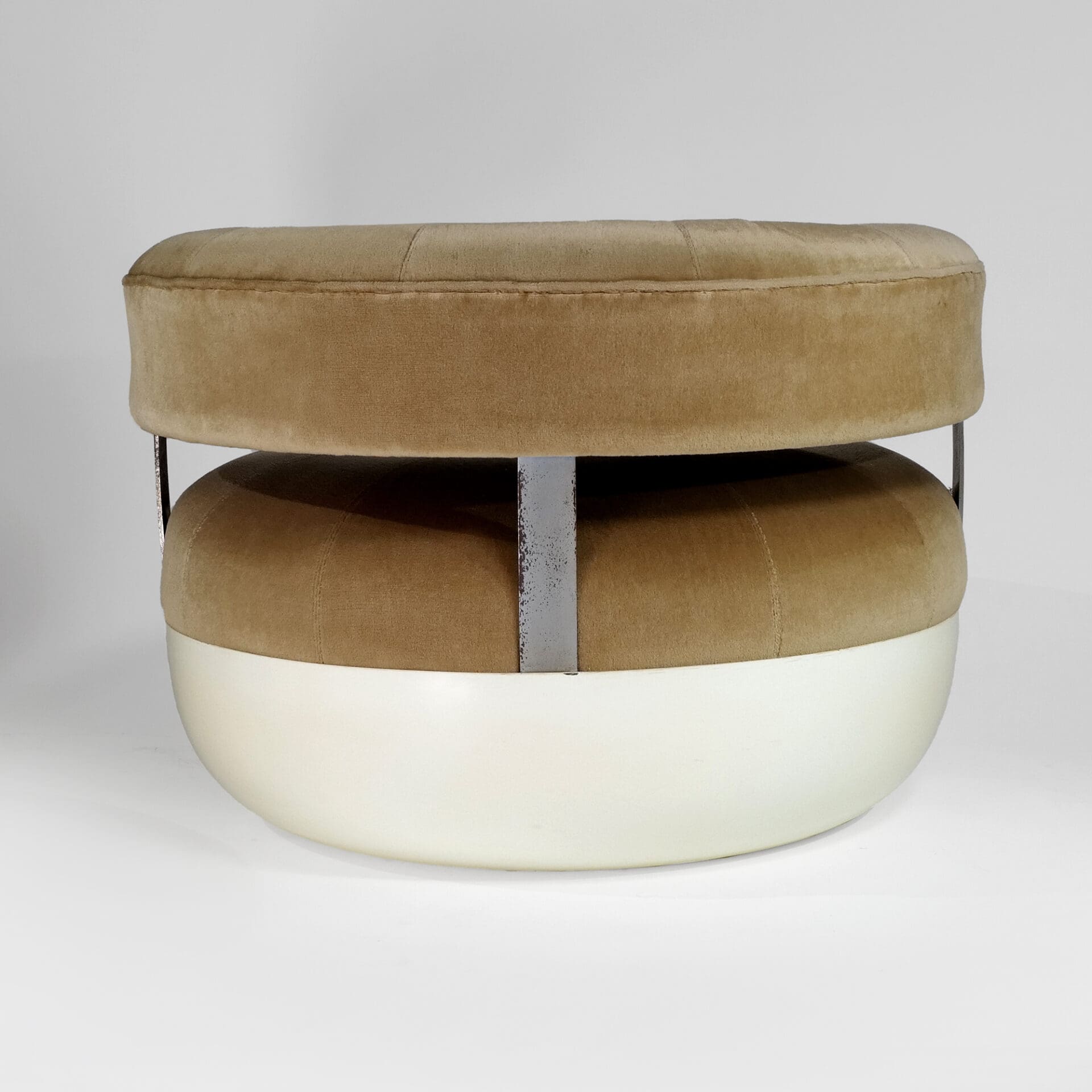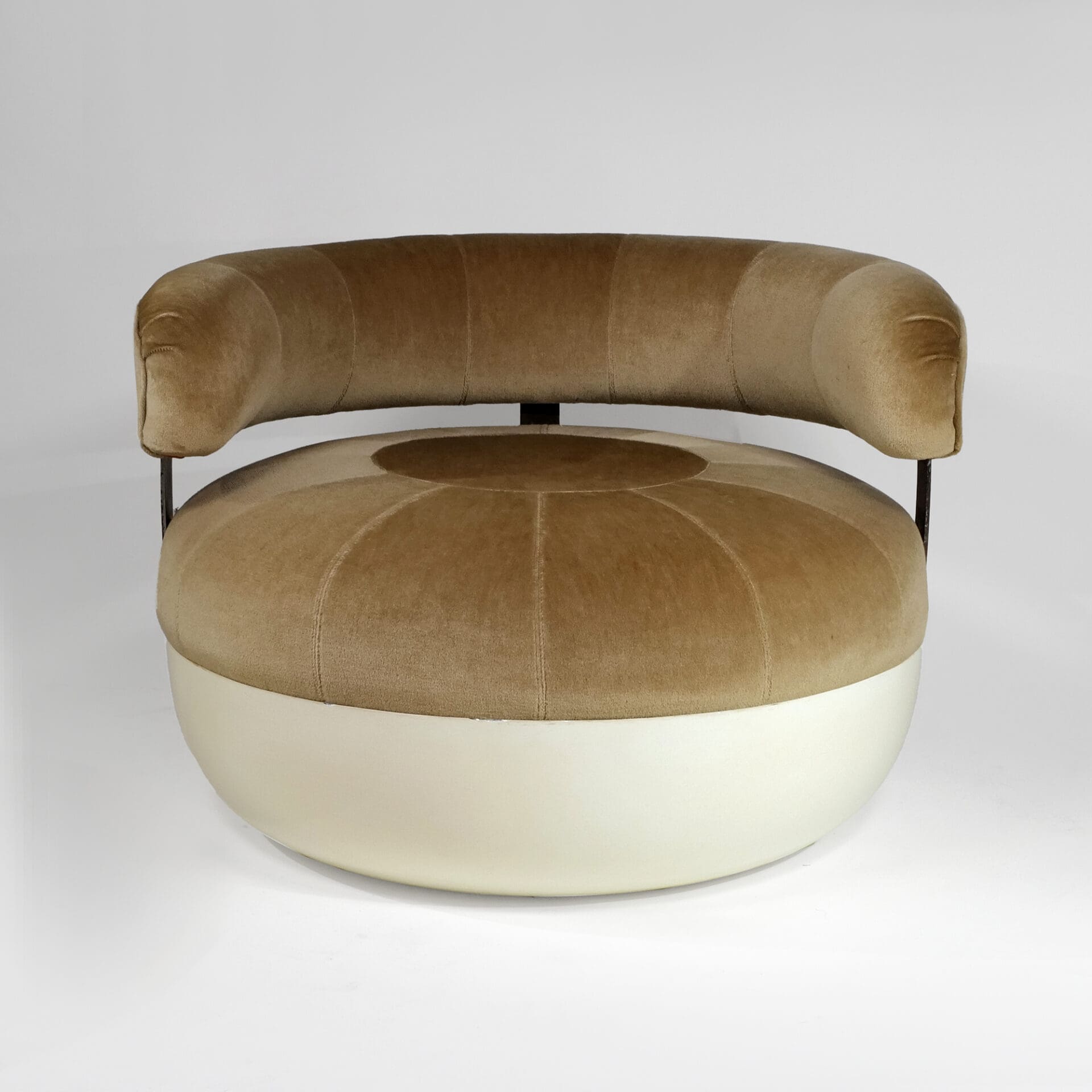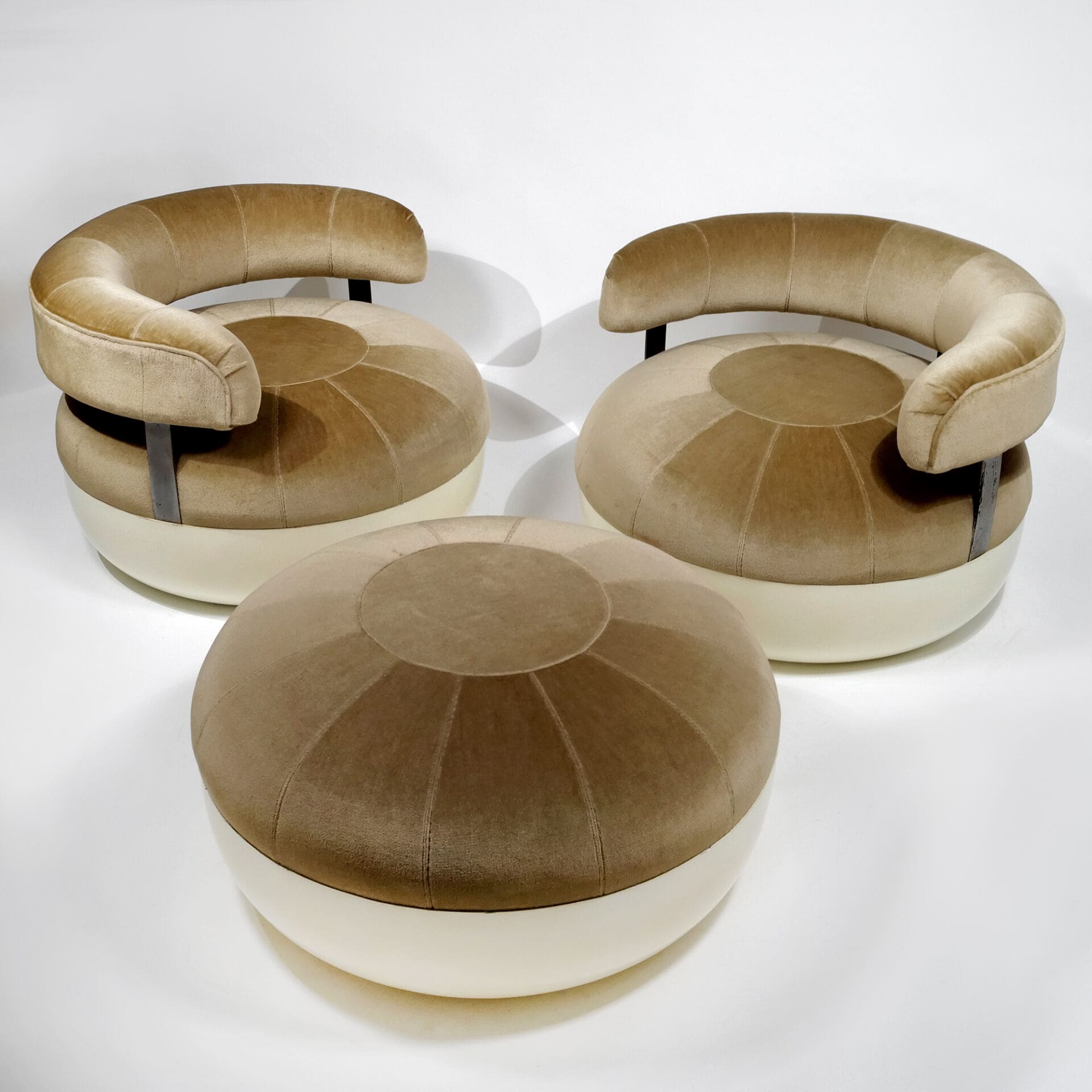 Rare ‘Mandarine’ pair of armchairs and footstool