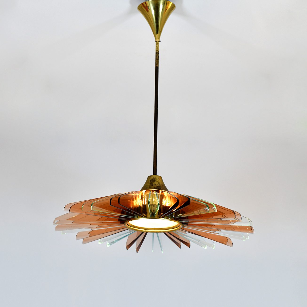 Max Ingrand (1908-1969) Rare Ceiling Light Brass, coloured glass, glass & frosted glass Produced by Fontana Arte c 1954 Italy