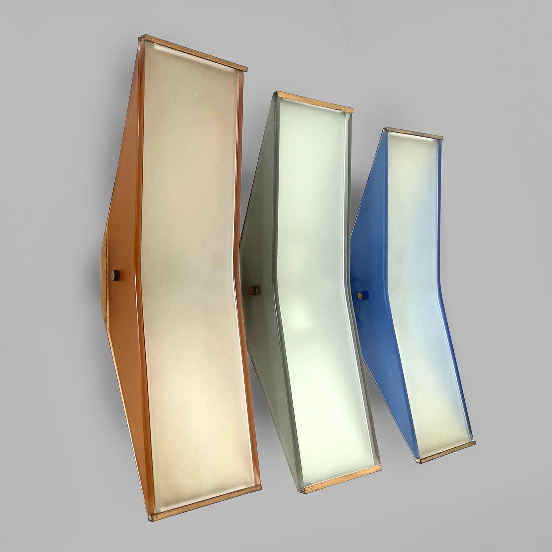 Max Ingrand (1908-1969) Three wall lights Brass, coloured glass and frosted glass Model 2135,produced by Fontana Arte c. 1962 Italy
