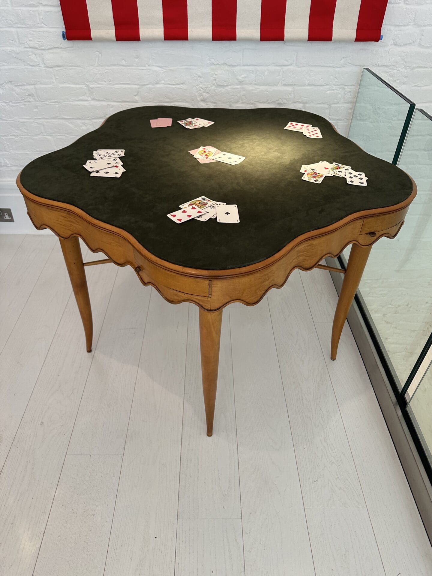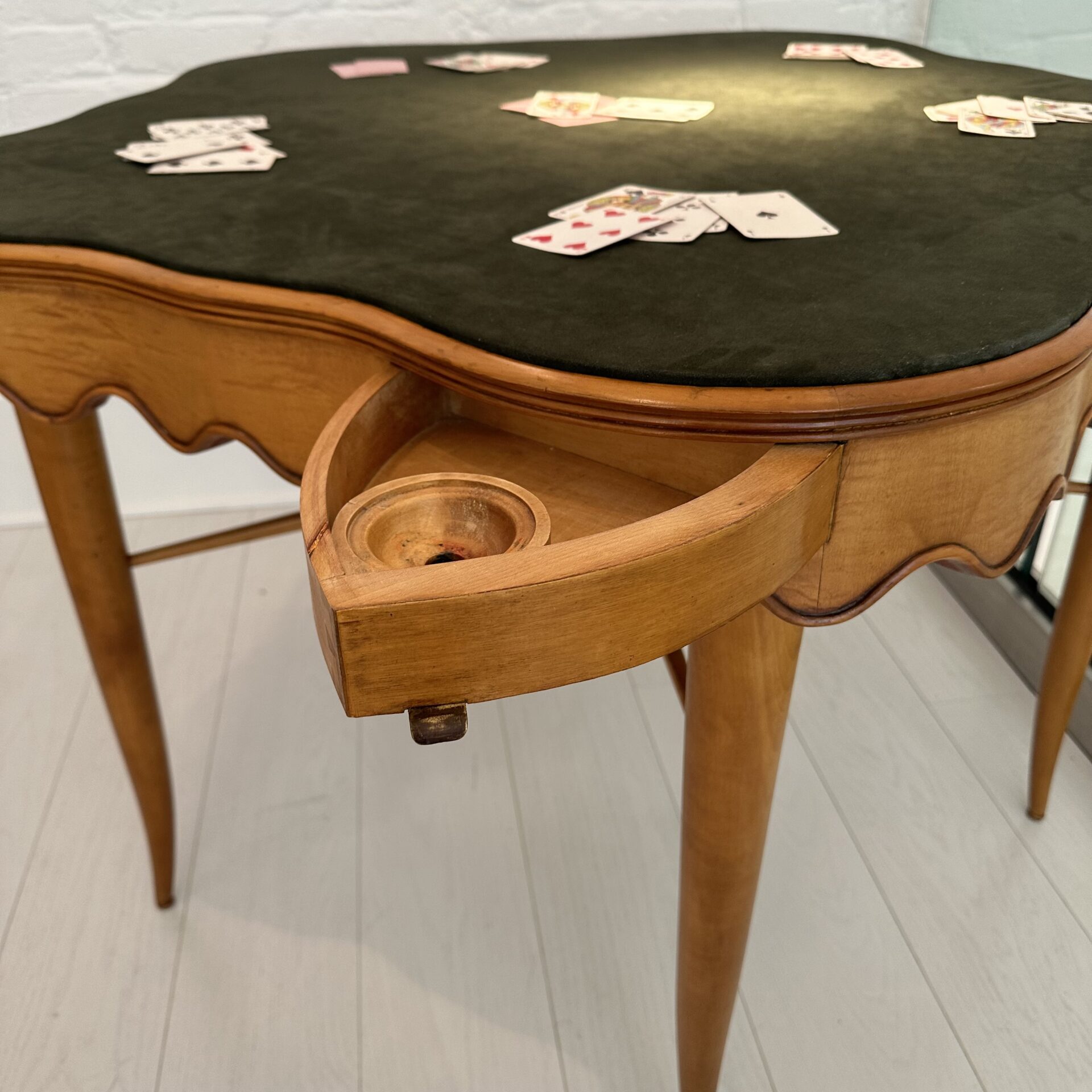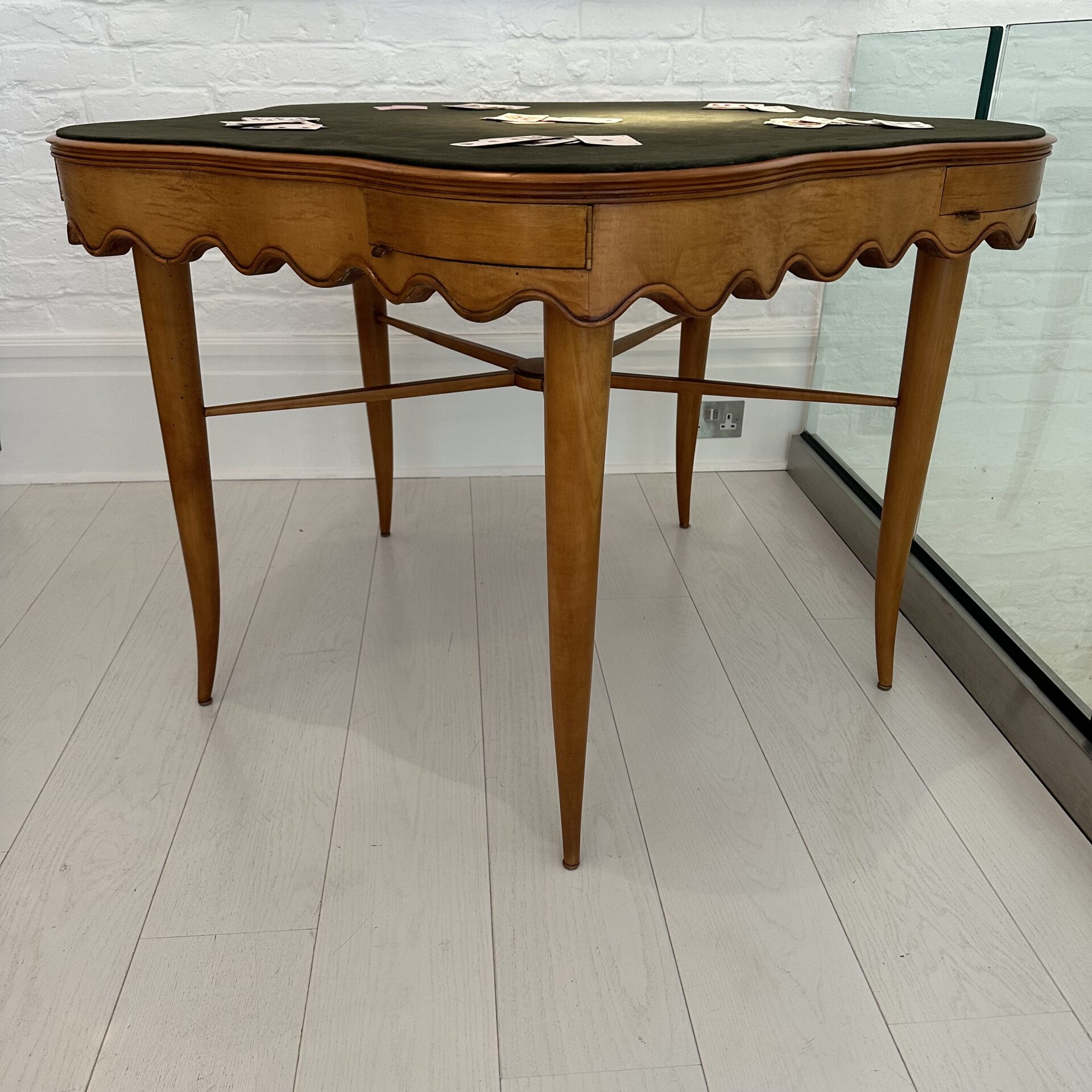 Attributed to Paolo Buffa (1903-1970) Rare games table Games table with scalloped edge and five drawers, the top inset with green faux suede Maple wood and faux suede c. 1950 Italy