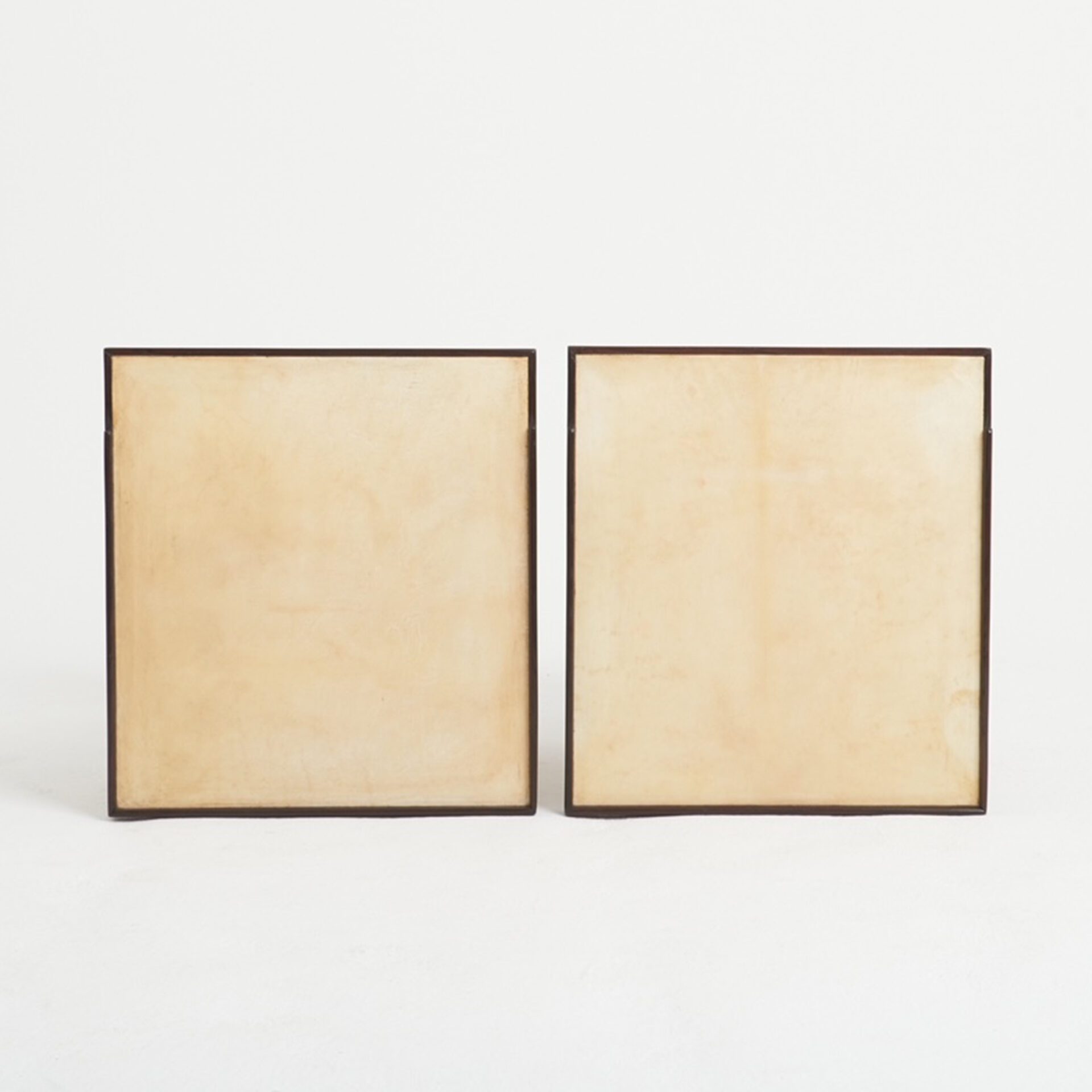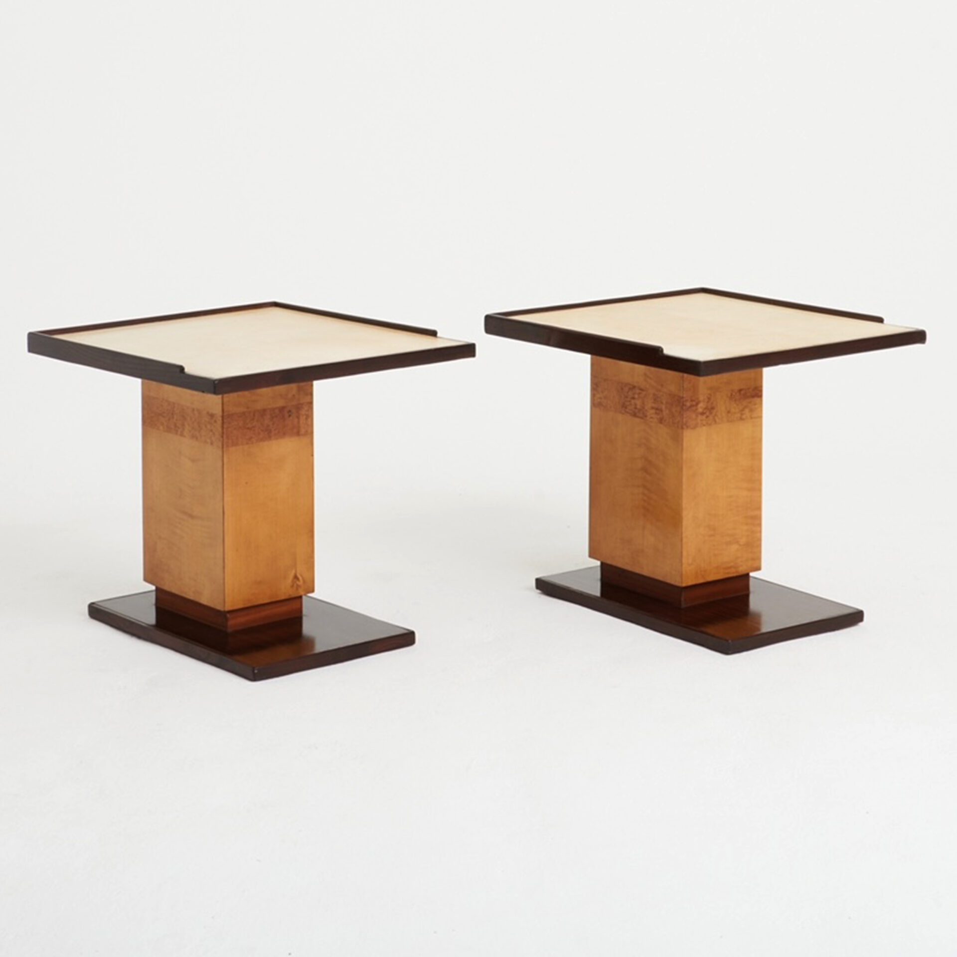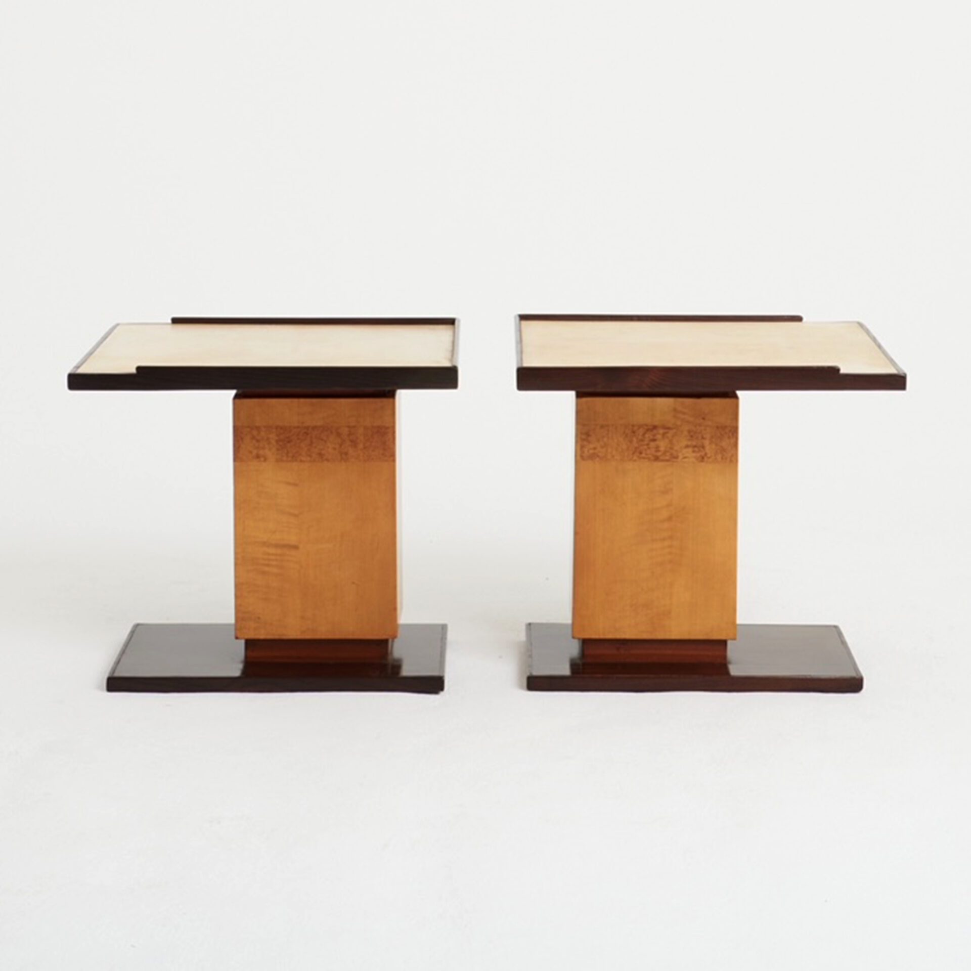 Paul Dupre-Lafon in the manner of (1900-1971) Pair of side tables Sapele, rosewood, sycamore and vellum c. 1960 France