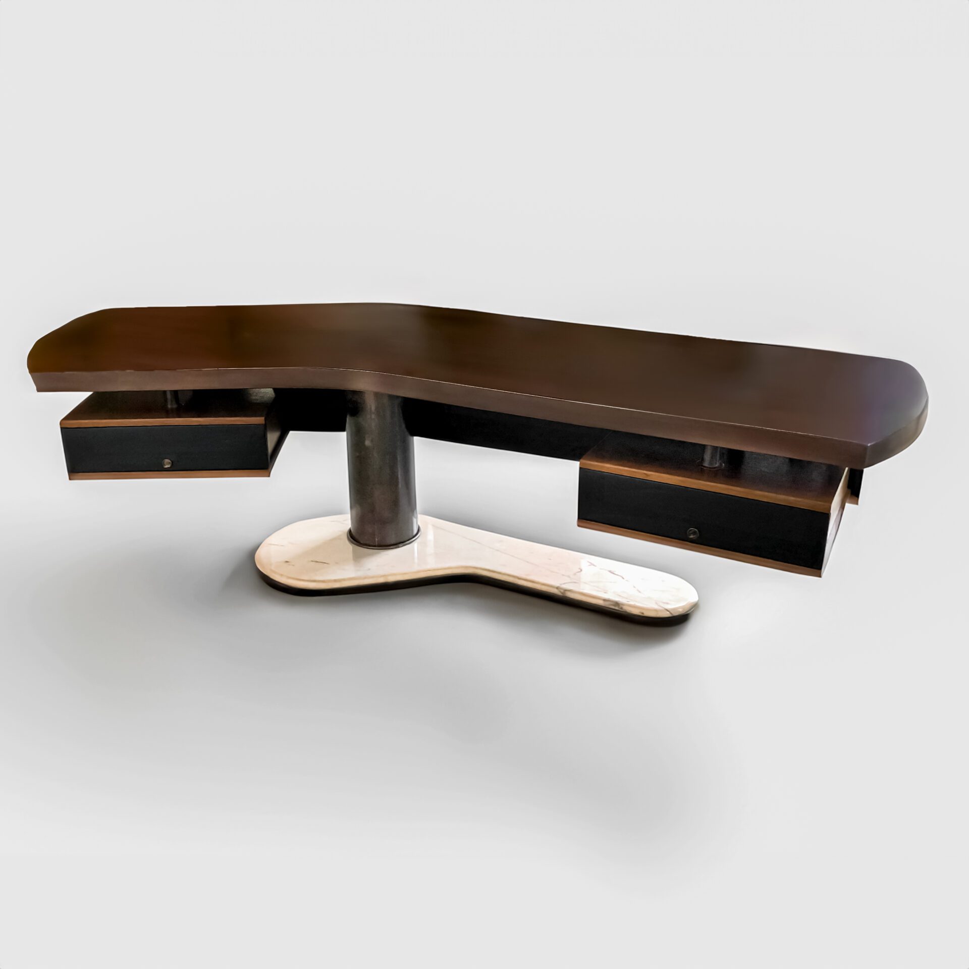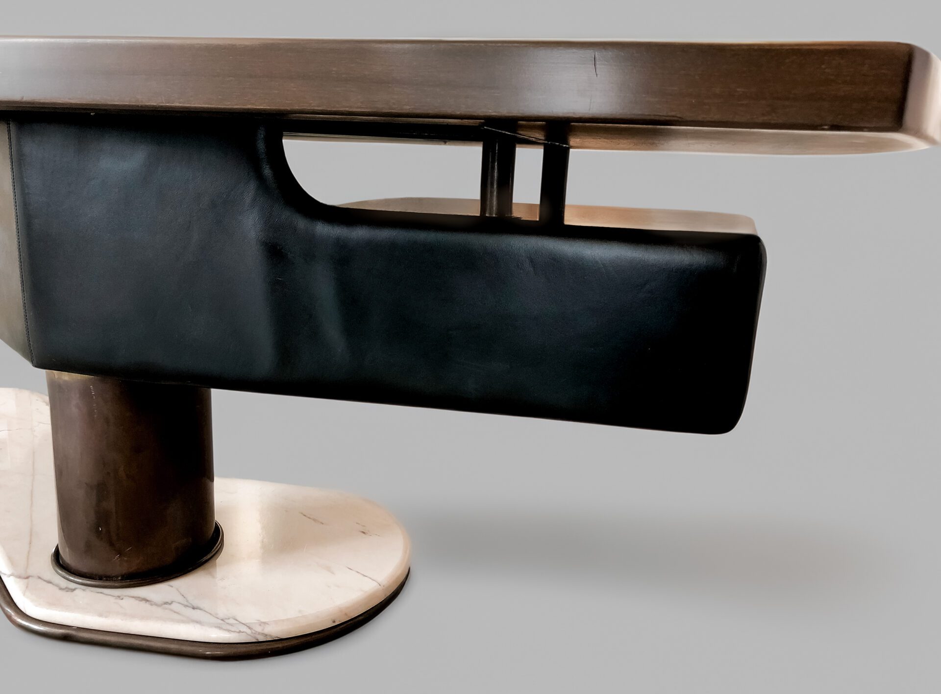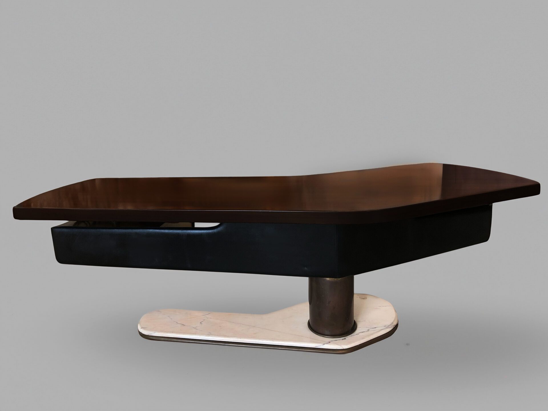 Renzo Schirolli (1934-2000) Rare asymmetrical’Boomerang’ desk Walnut, brass, leather and marble Edited by Schirolli c. 1960 Italy