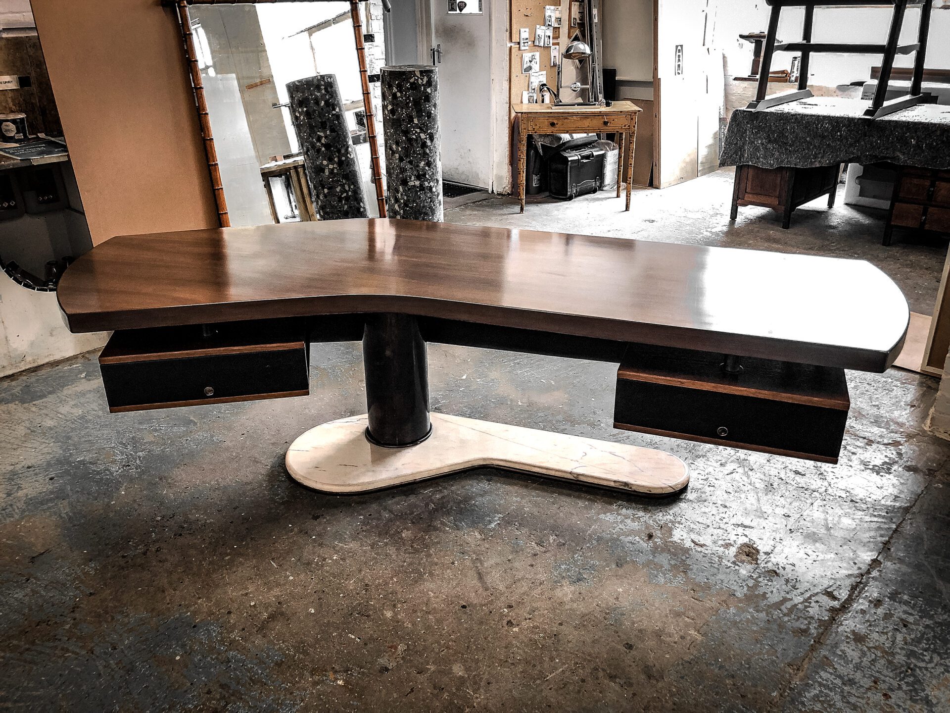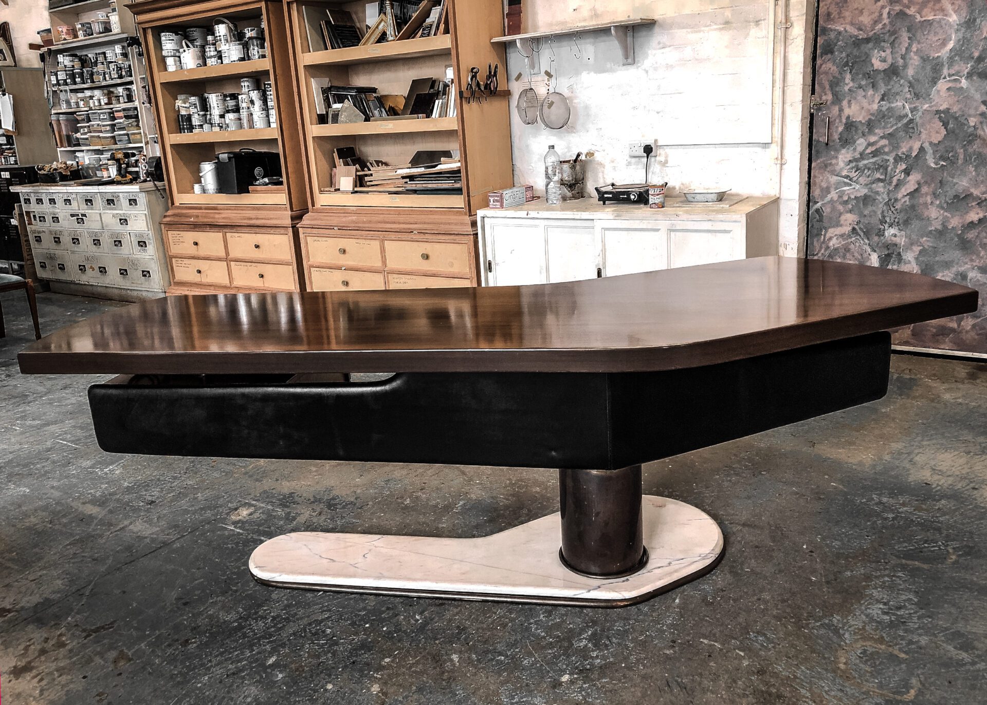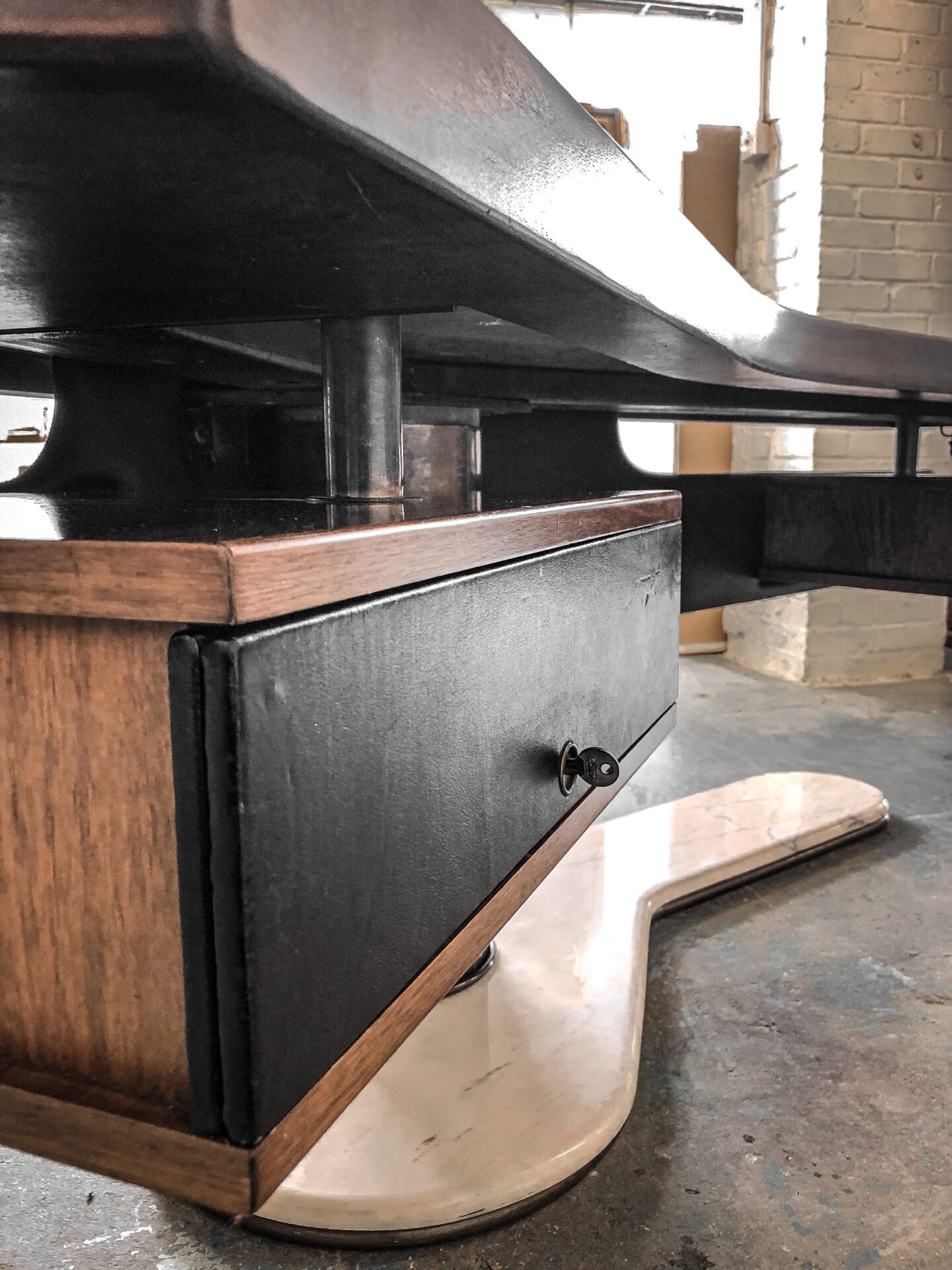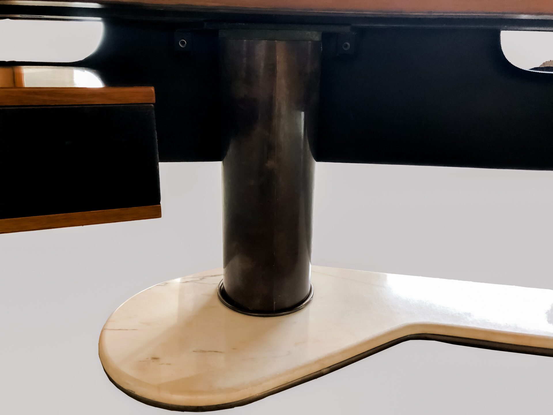 Renzo Schirolli (1934-2000) Rare asymmetrical’Boomerang’ desk Walnut, brass, leather and marble Edited by Schirolli c. 1960 Italy
