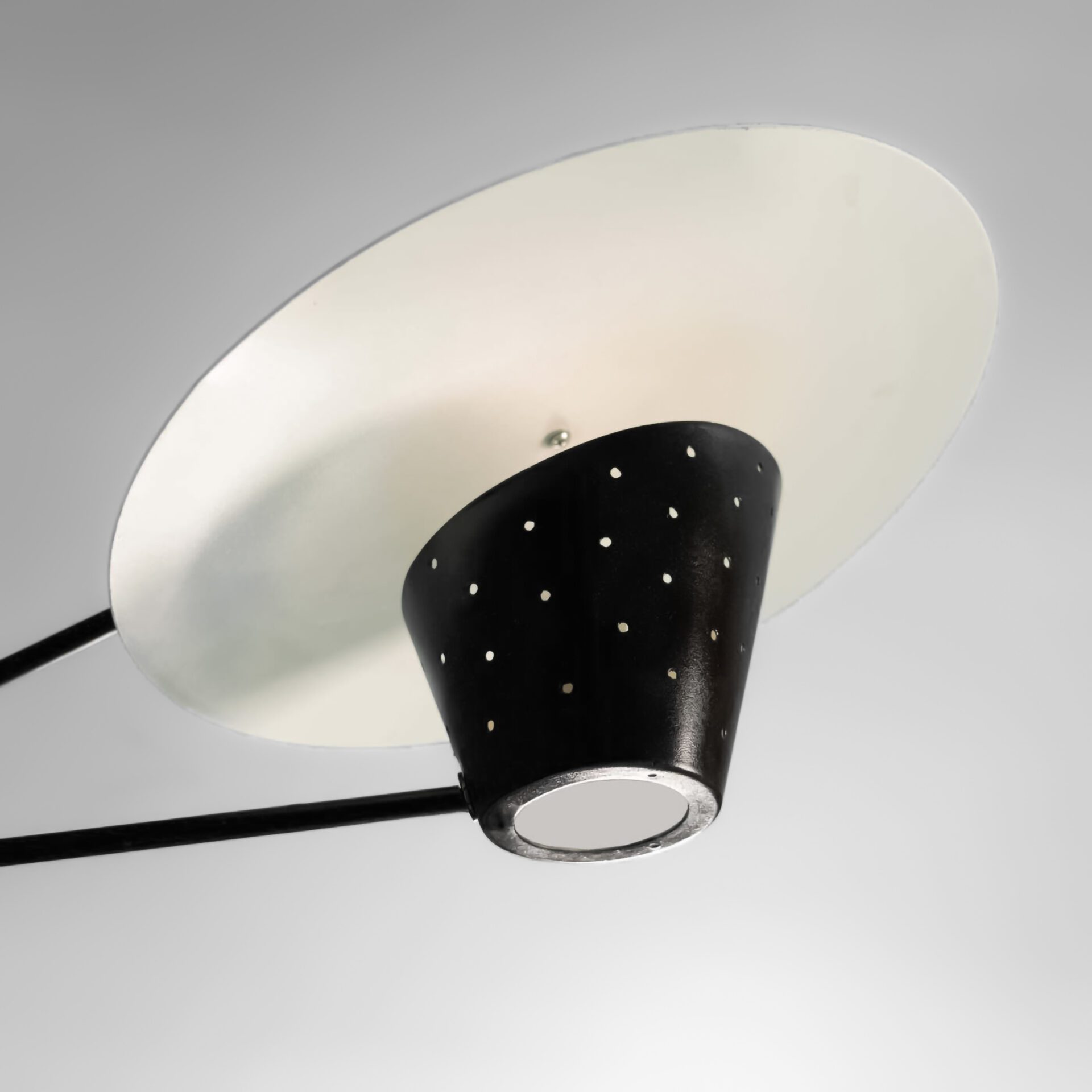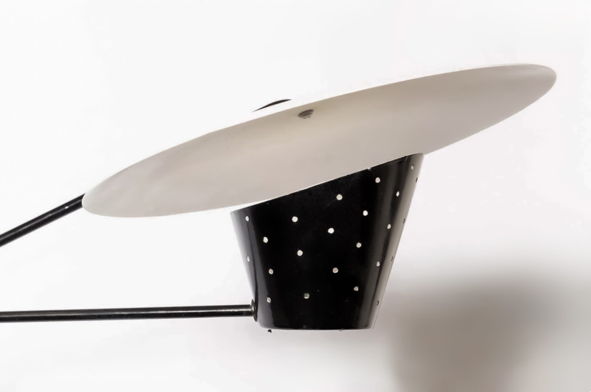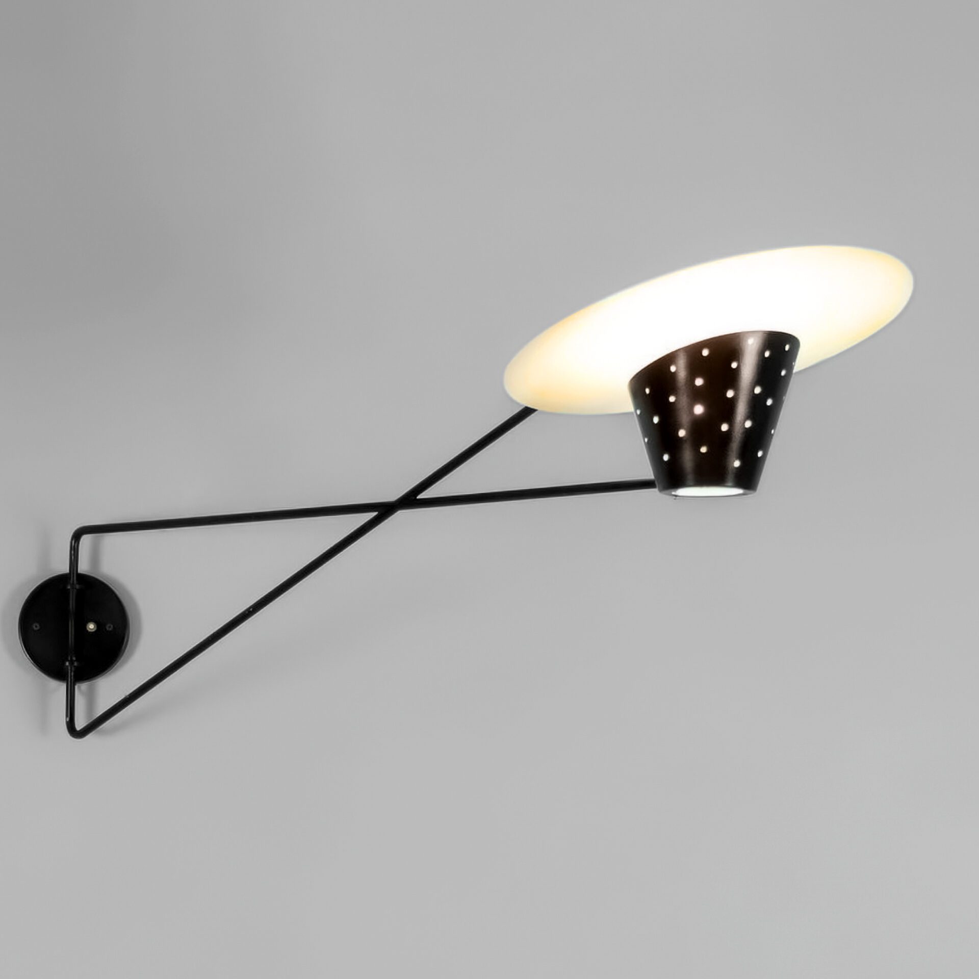 Robert Caillat (-1955) Swing arm wall light Frosted glass, lacquered and perforated metal Produced by Caillat Ed. c. 1950 France