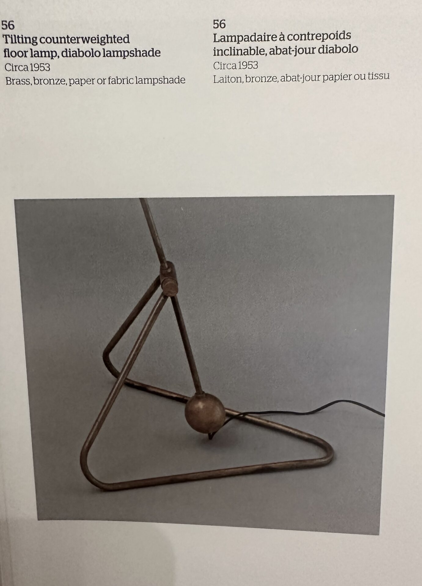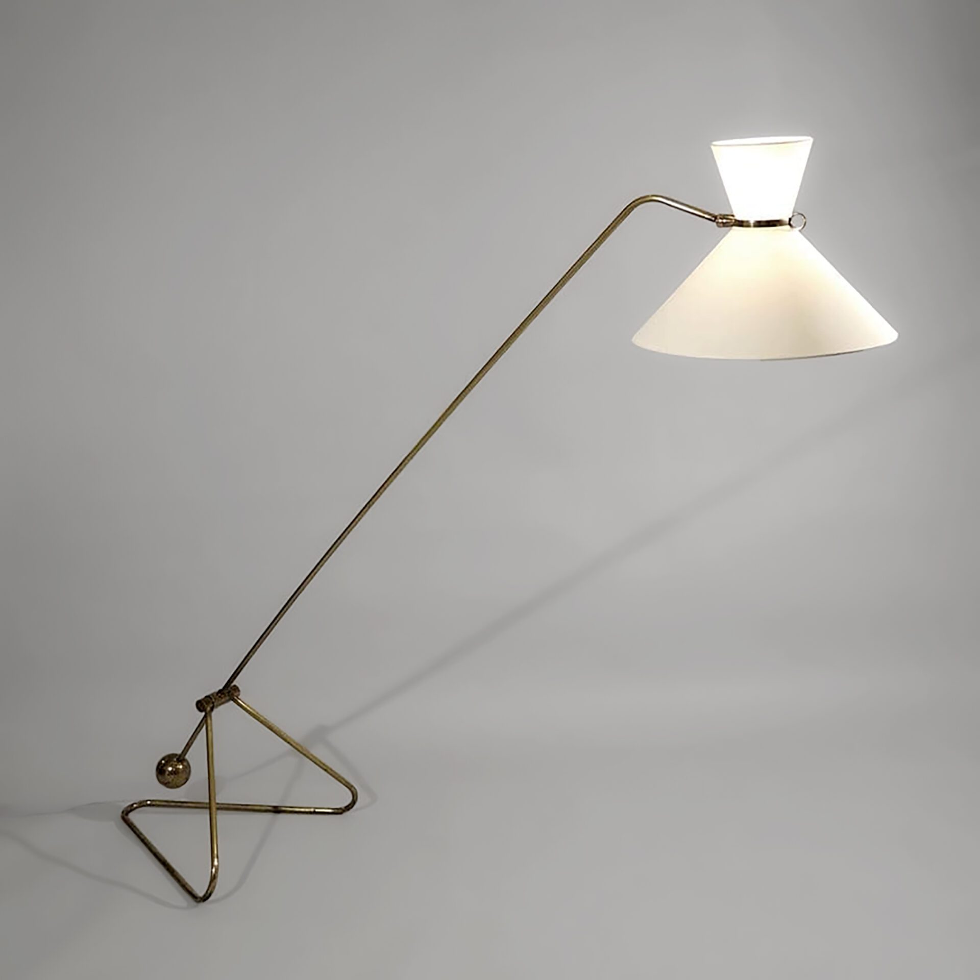 Robert Mathieu (1921-2002) Counterweight floor lamp, Model 56 Brass and diabolo shades Produced by Robert Mathieu Luminaires c. 1950 France