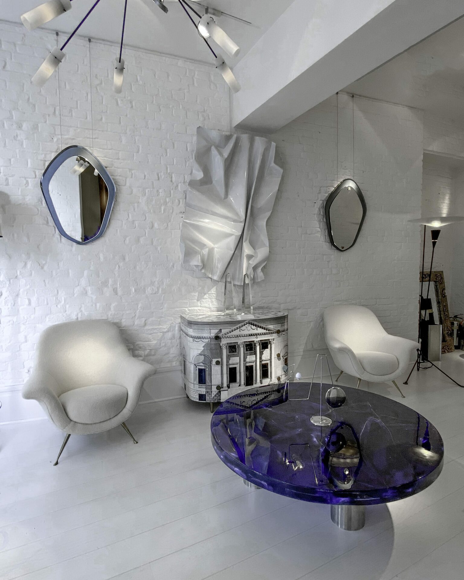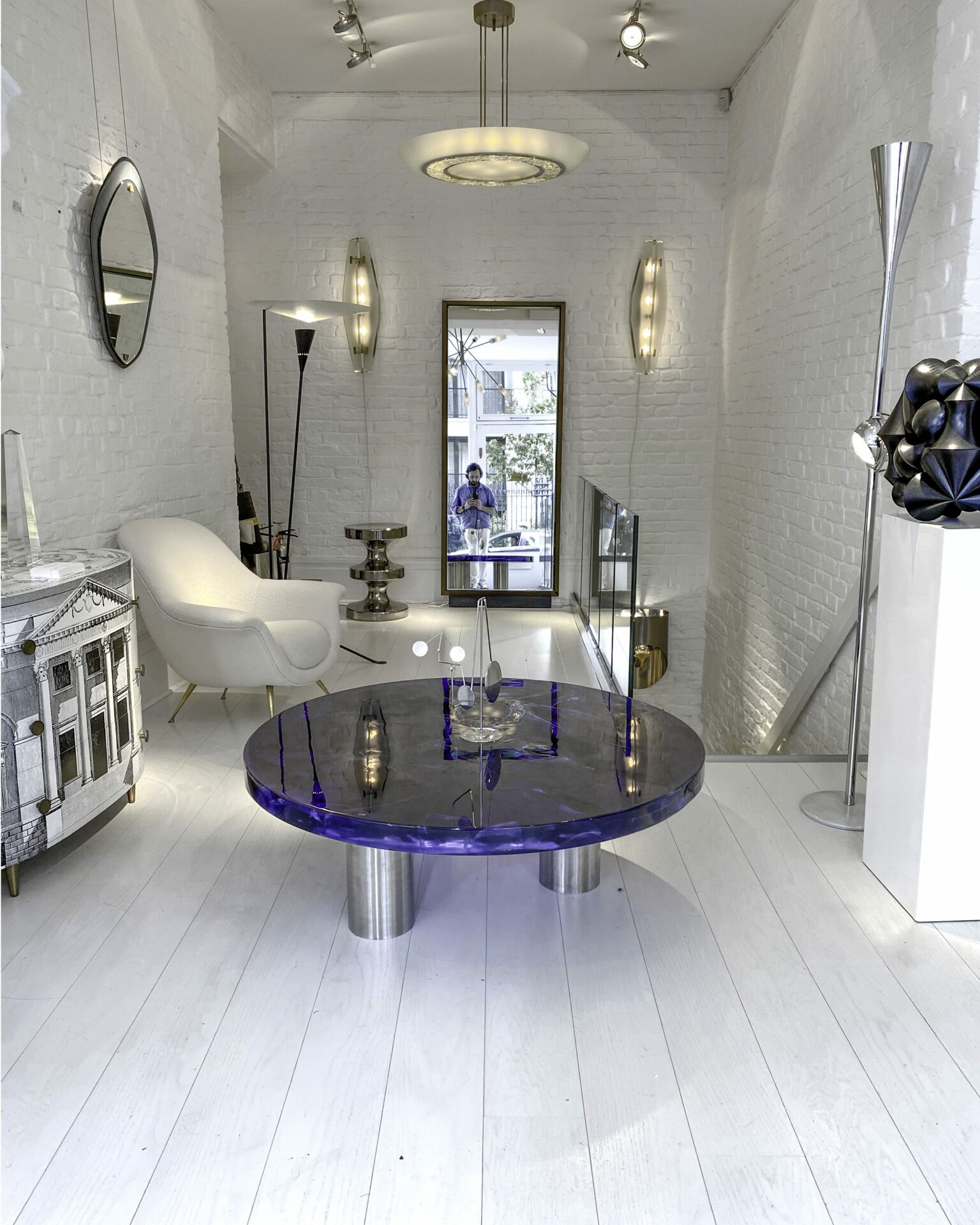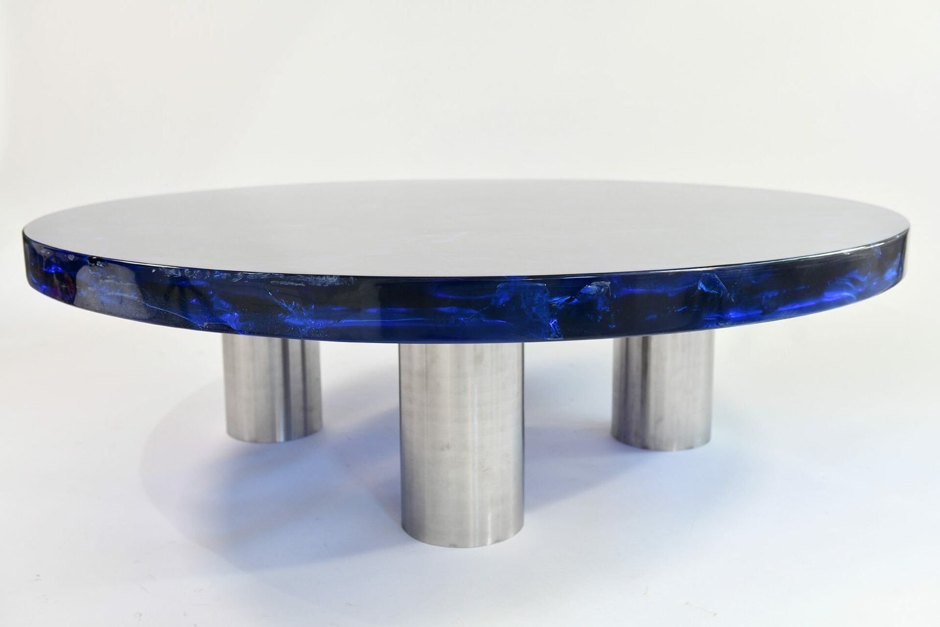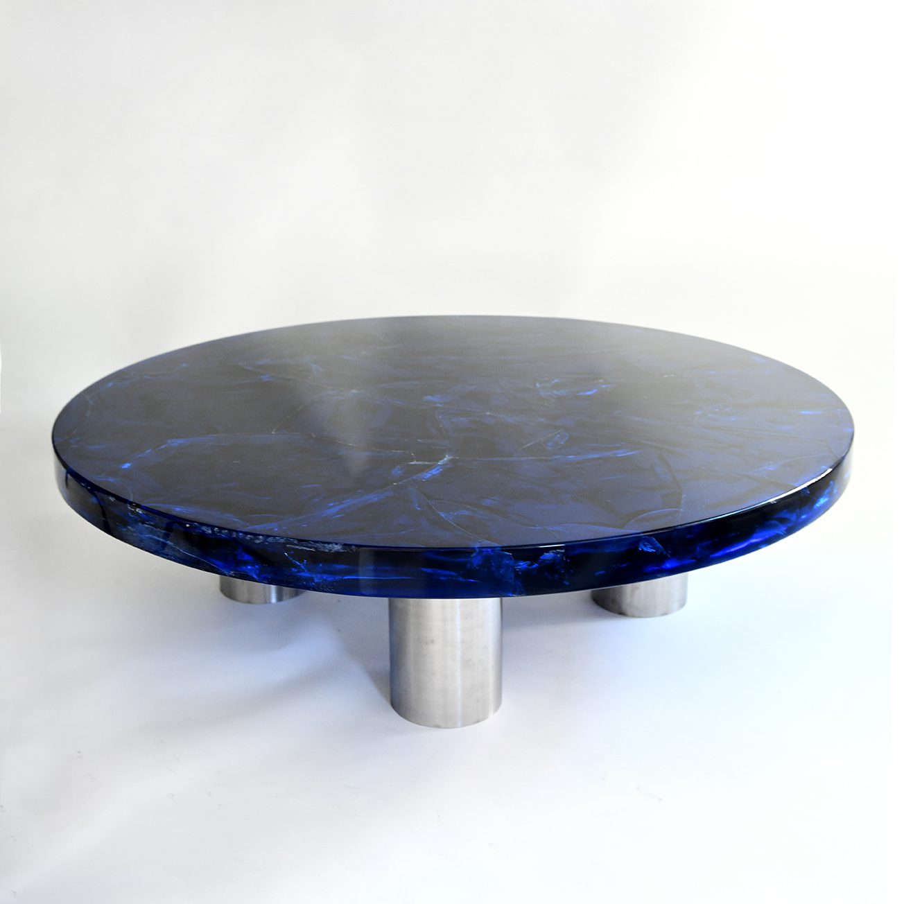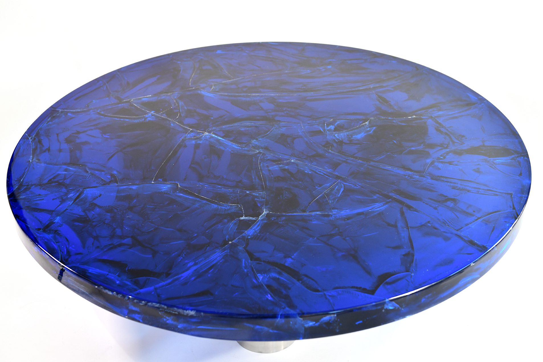 Portuondo Editions Circular coffee table Coloured fractal resin on cylindrical brushed steel feet 2023 France/UK