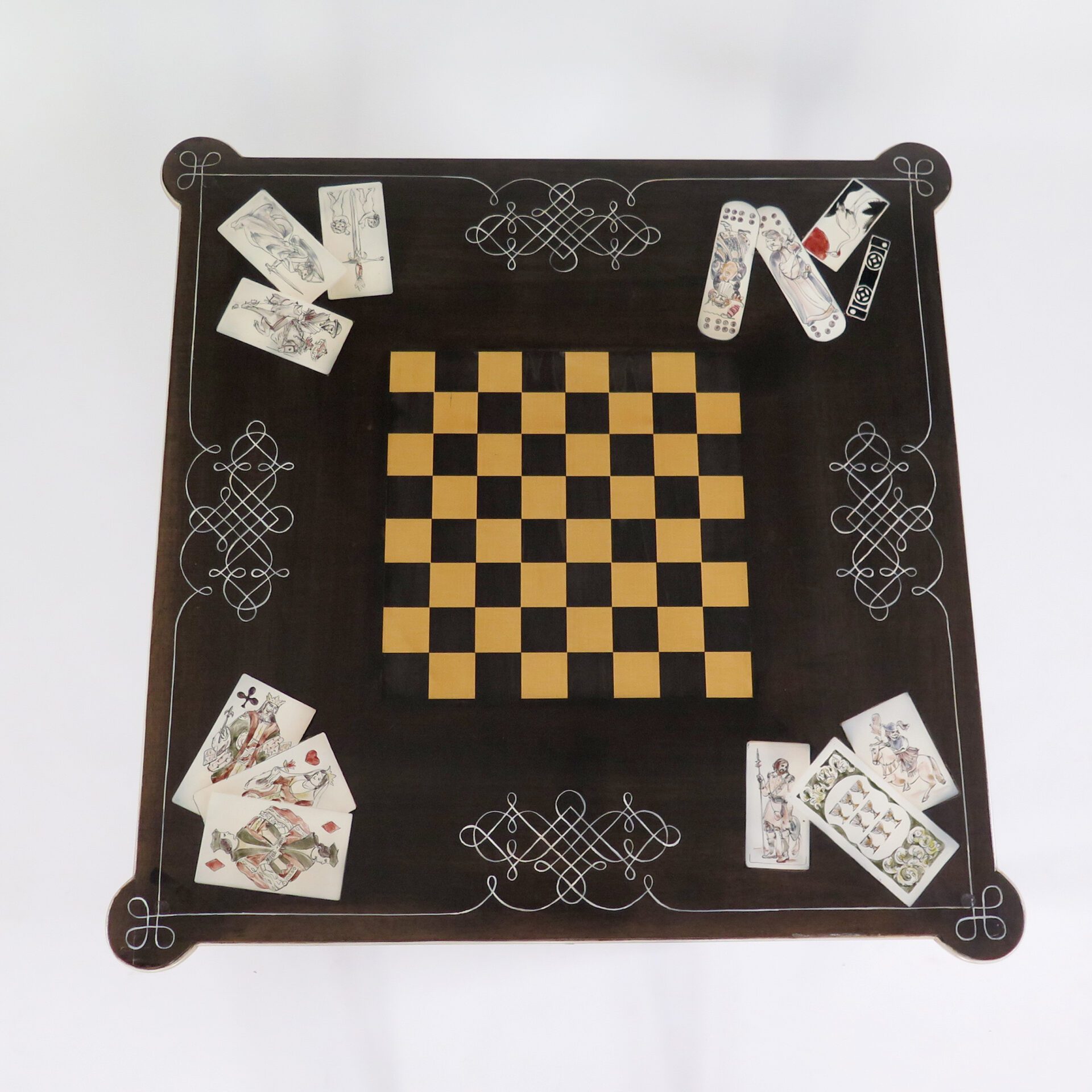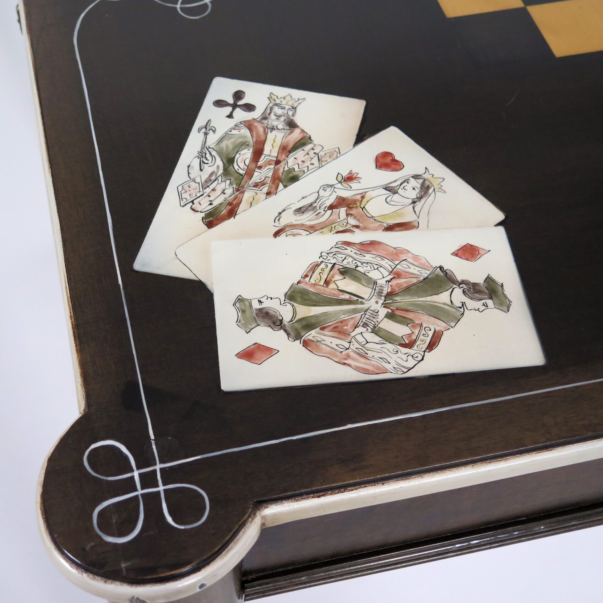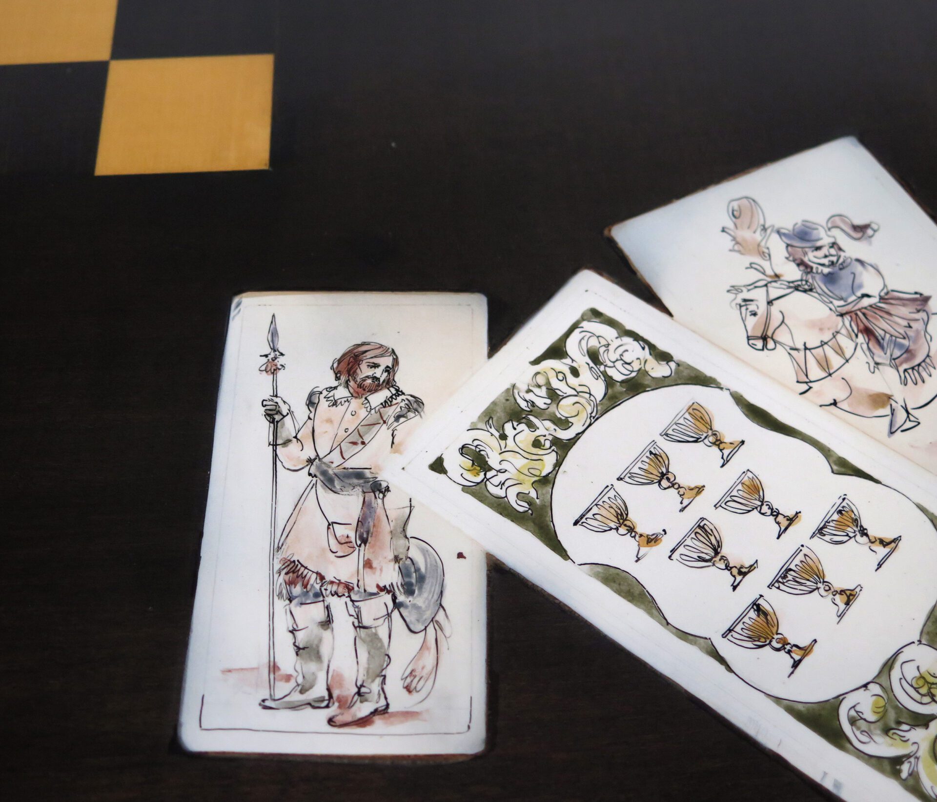 Trompe-l’oeil decorations of checker board, playing cars and gaming motifs