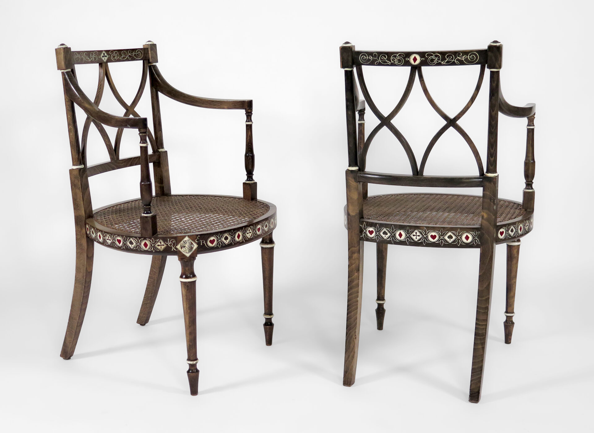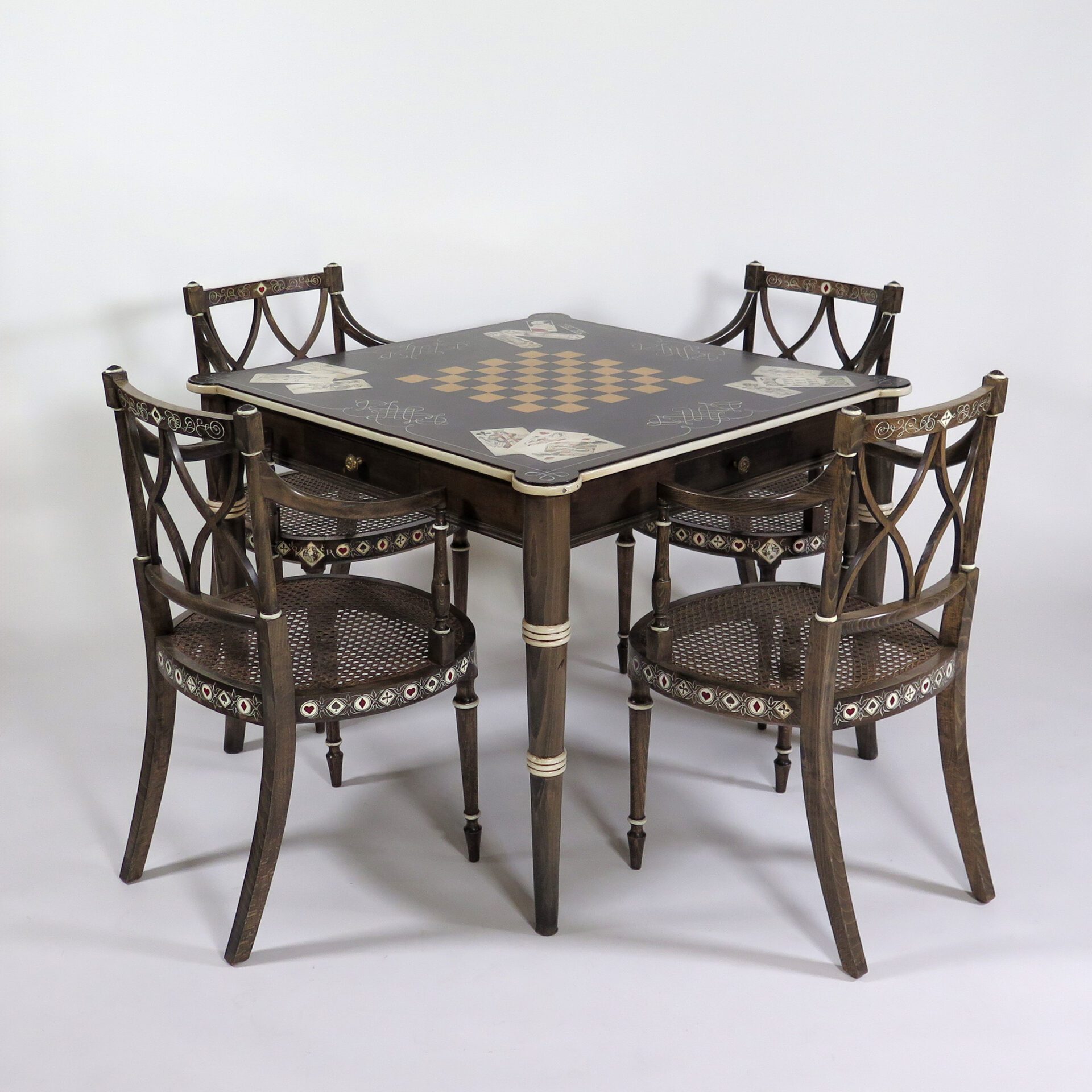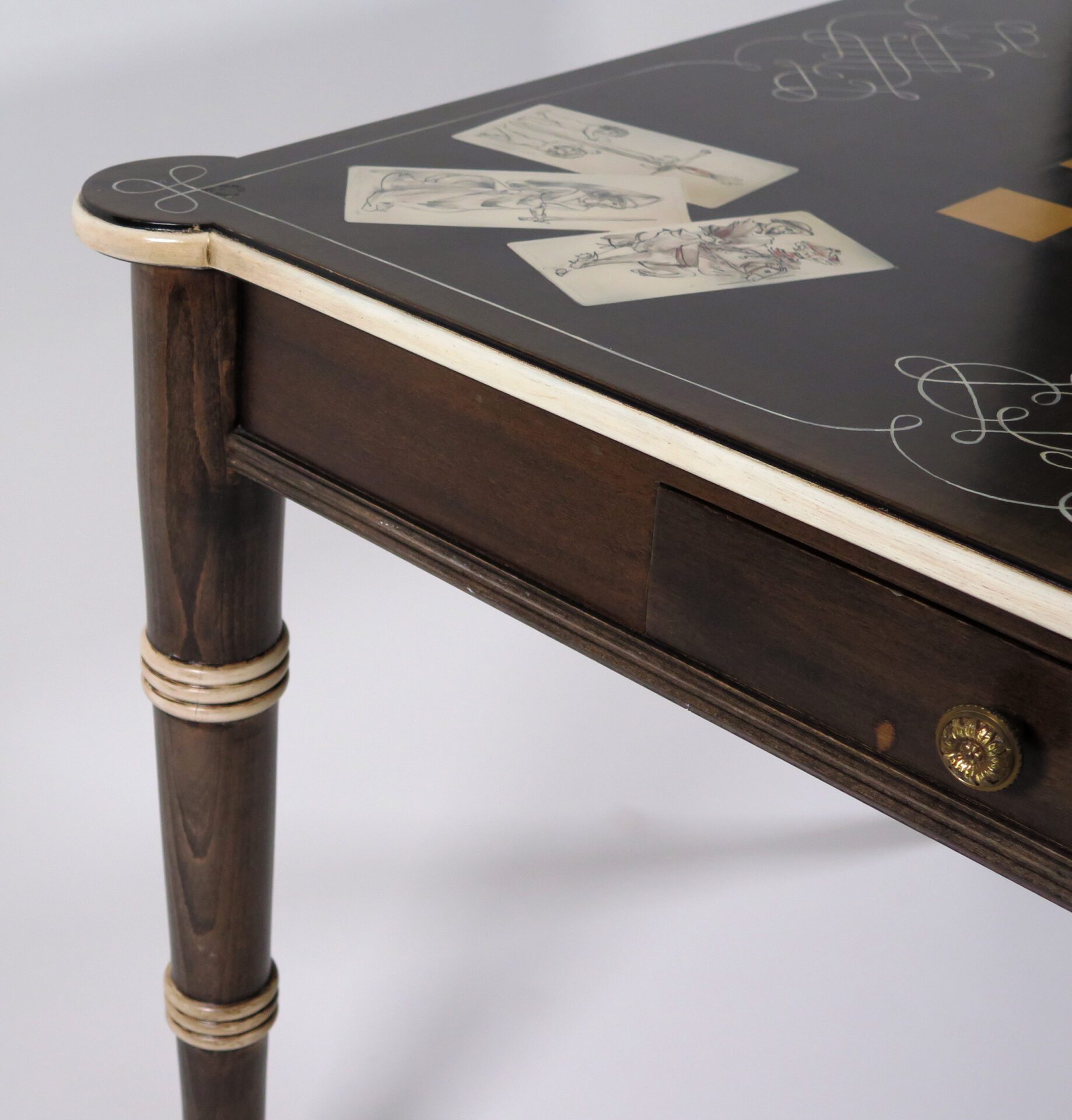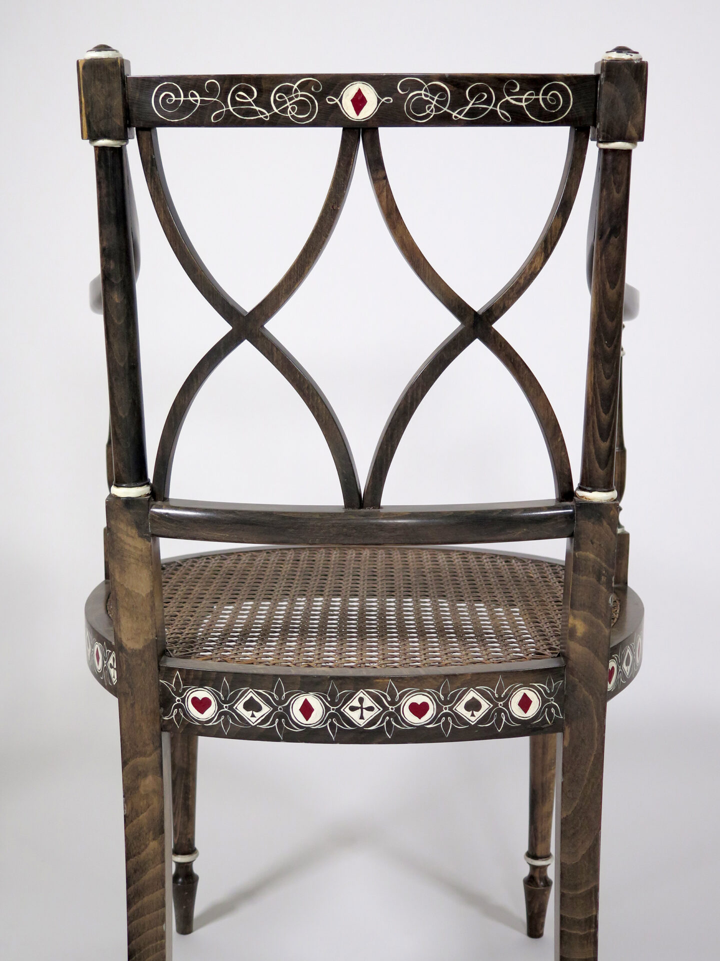 Trompe-l’oeil decorations of checker board, playing cars and gaming motifs